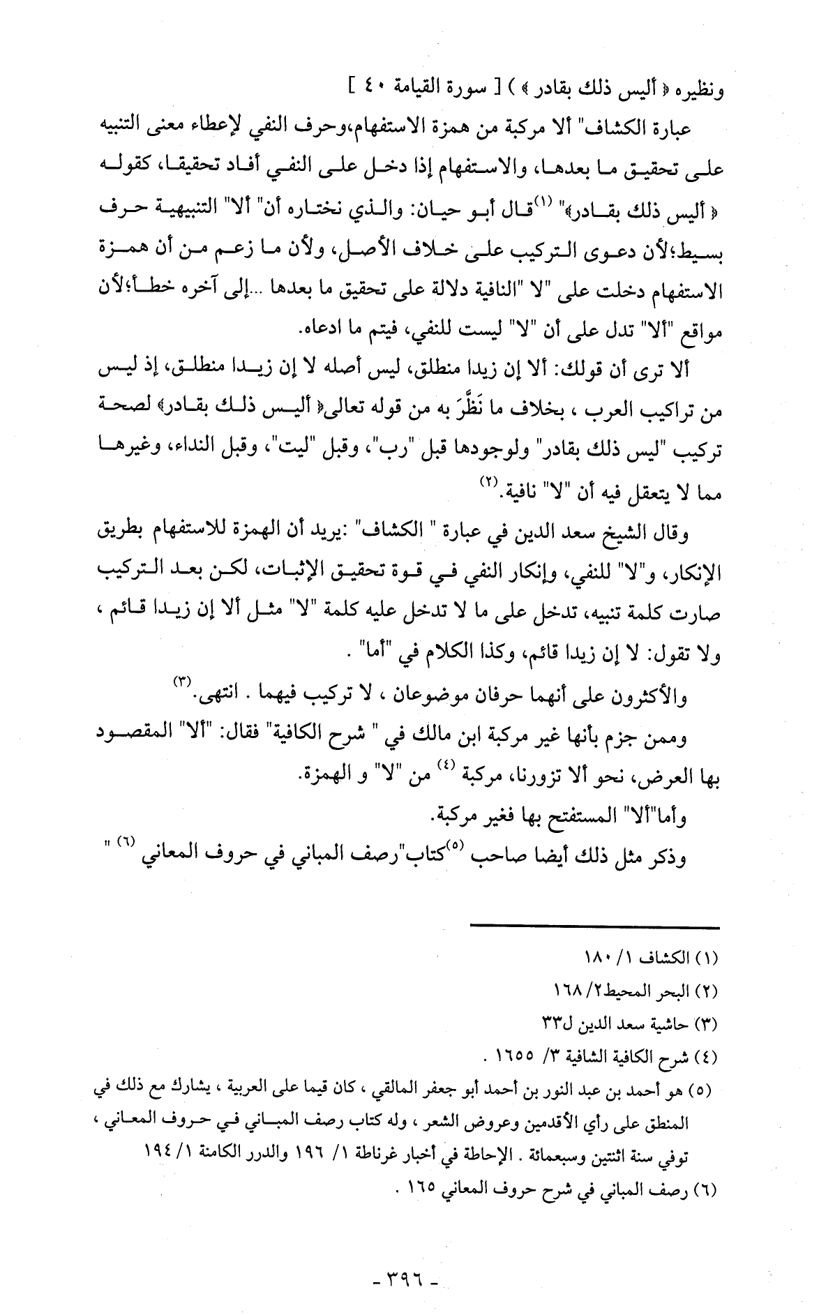 ألا ترى أن قولك: ألا إن زيدا منطلق، ليس أصله لا إن زيدا منطلق؛ إذ ليس من تراكيب العرب، بخلاف ما نَظَّرَ به من قوله تعالى (أليس ذلك بقادر) لصحة تركيب " ليس ذلك بقادر " ولوجودها قبل " رب "، وقبل " ليت "، وقبل النداء، وغيرها مما لا يتعقل فيه أن " لا " نافية (2).