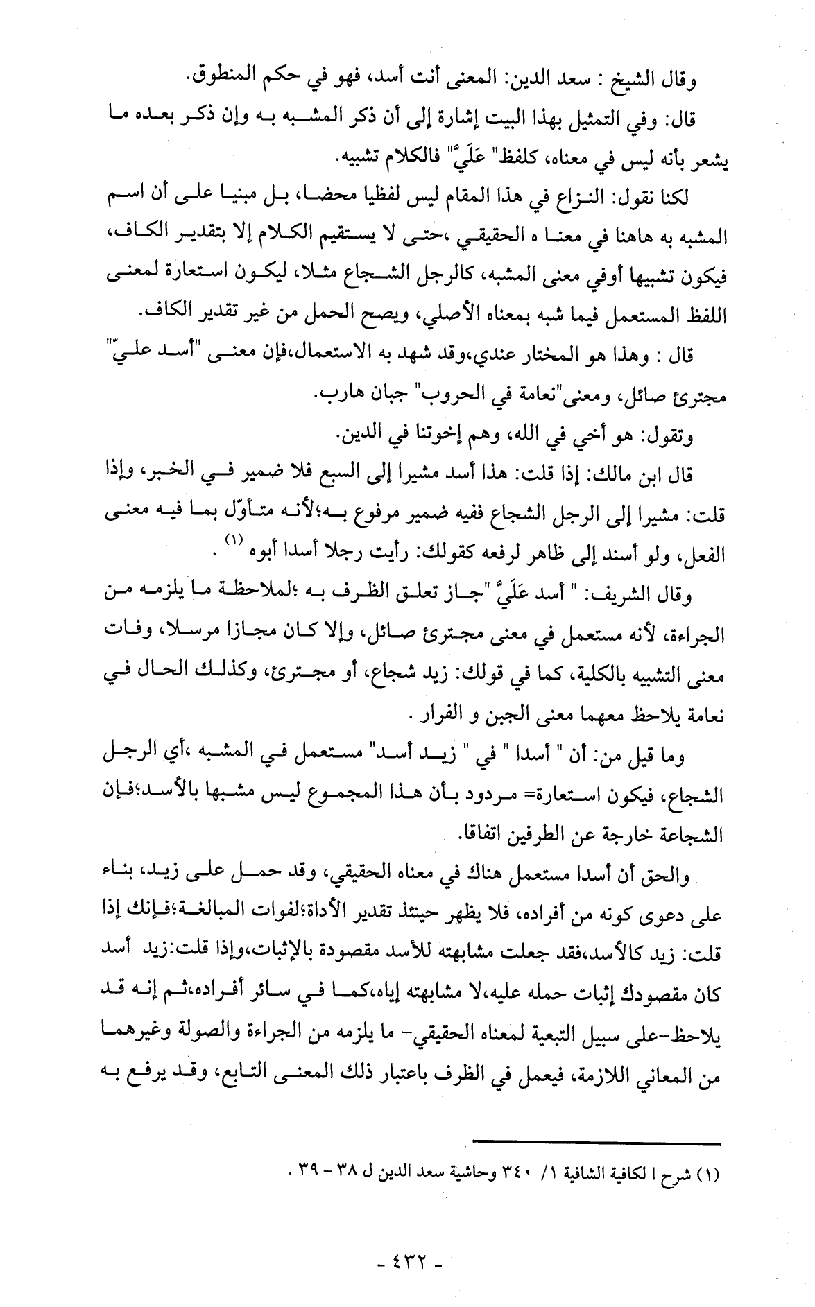 وما قيل من: أن " أسدا " في " زيد أسد " مستعمل في المشبه، أي الرجل الشجاع، فيكون استعارة = مردود بأن هذا المجموع ليس مشبها بالأسد؛ فإن الشجاعة خارجة عن الطرفين اتفاقا.