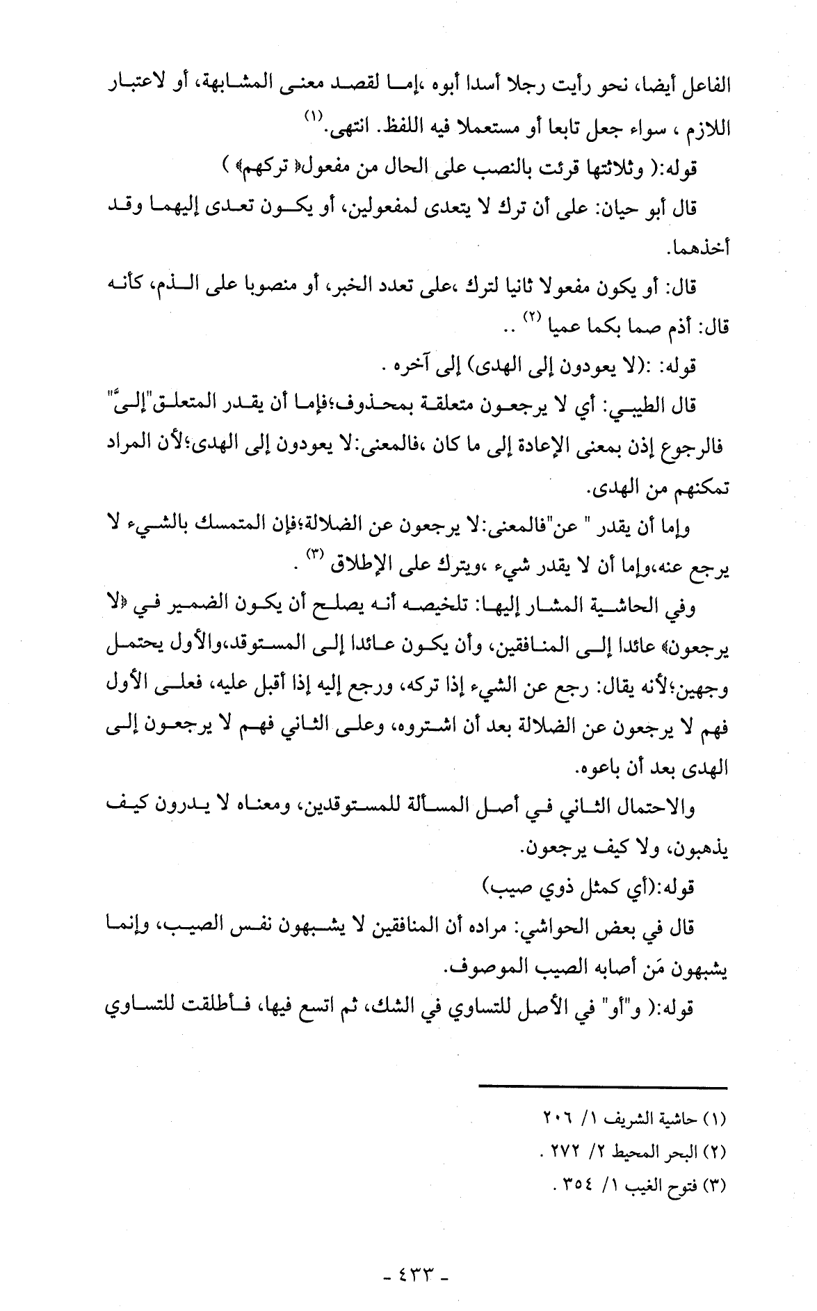وفي الحاشية المشار إليها: تلخيصه أنه يصلح أن يكون الضمير في (لا يرجعون) عائدا إلى المنافقين، وأن يكون عائدا إلى المستوقد، والأول يحتمل وجهين؛ لأنه يقال: رجع عن الشيء إذا تركه، ورجع إليه إذا أقبل عليه، فعلى الأول فهم لا يرجعون عن الضلالة بعد أن اشتروه، وعلى الثاني فهم لا يرجعون إلى الهدى بعد أن باعوه.