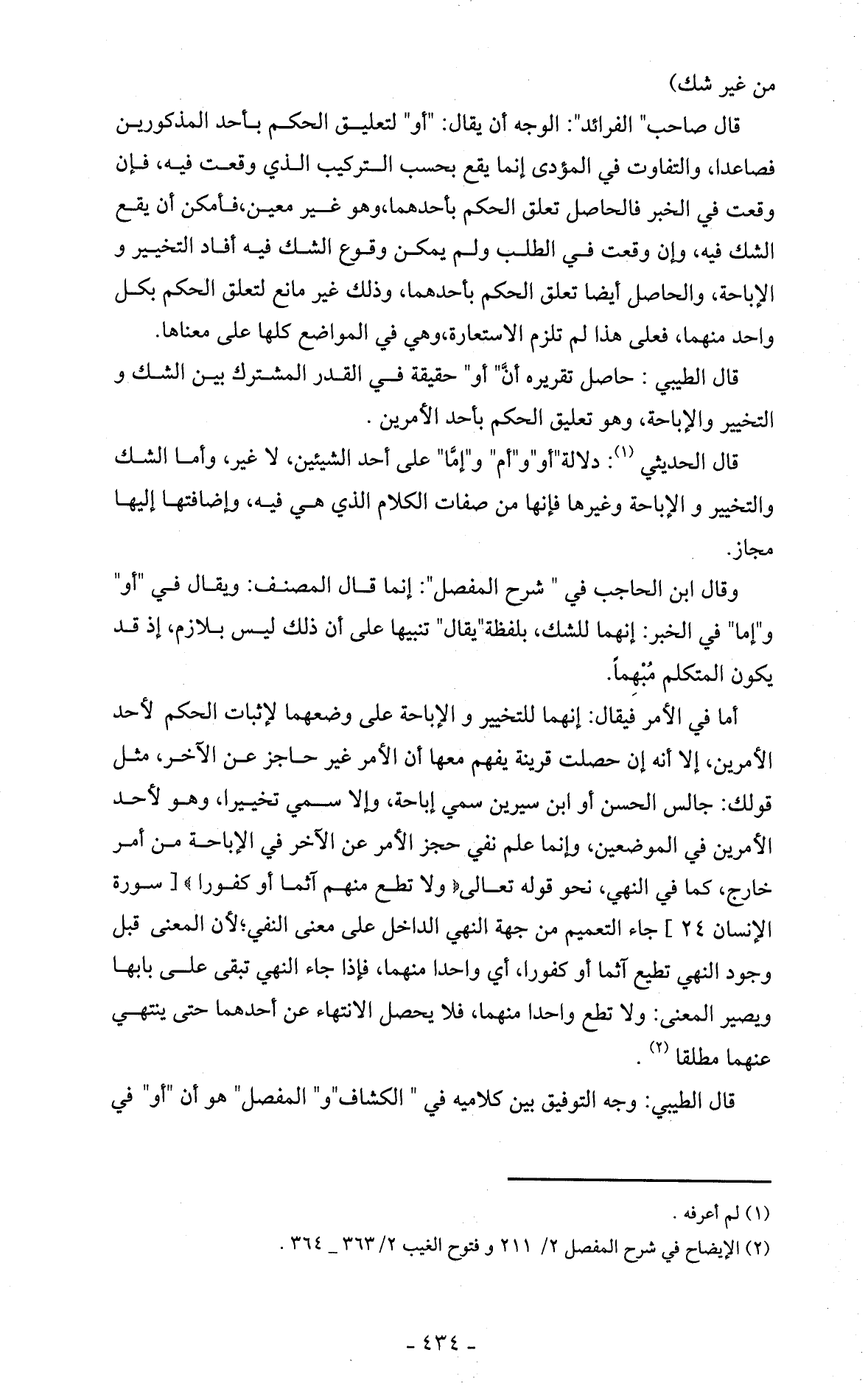 قال الطيبي: حاصل تقريره أنَّ " أو " حقيقة في القدر المشترك بين الشك والتخيير والإباحة، وهو تعليق الحكم بأحد الأمرين.