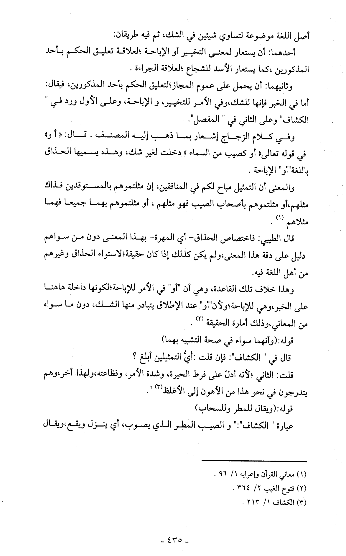 وفي كلام الزجاج إشعار بما ذهب إليه المصنف. قال: (أو) في قوله تعالى (أو كصيب من السماء) دخلت لغير شك، وهذه يسميها الحذاق باللغة " أو " الإباحة.