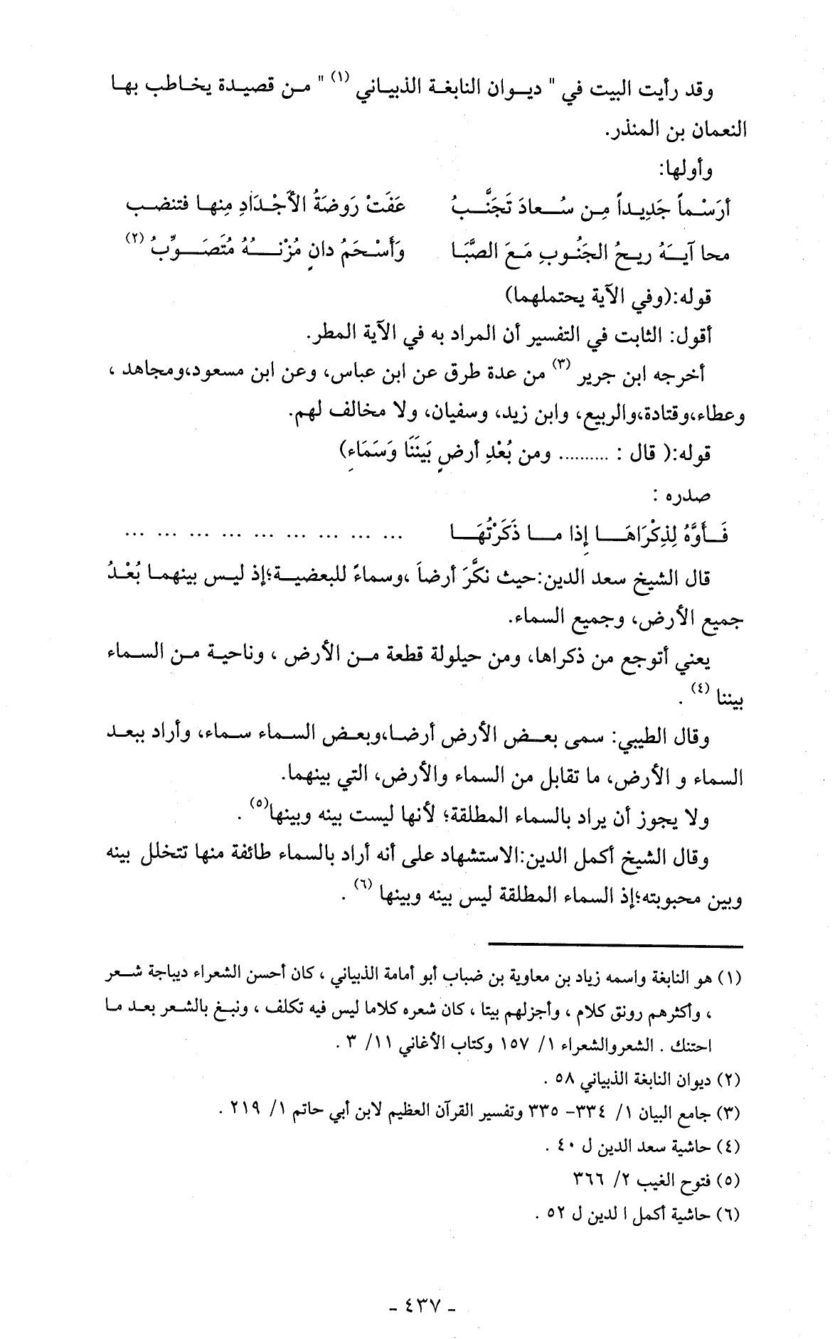 وقال الشيخ أكمل الدين: الاستشهاد على أنه أراد بالسماء طائفة منها تتخلل بينه وبين محبوبته؛ إذ السماء المطلقة ليس بينه وبينها (6).