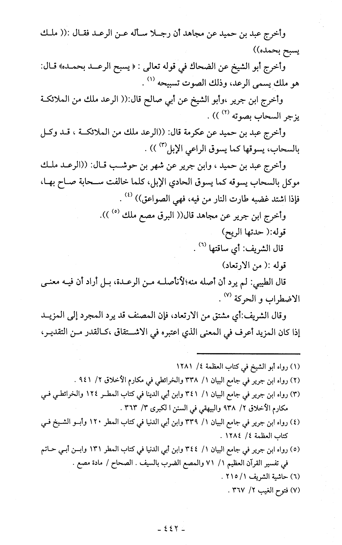 وأخرج عبد بن حميد، وابن جرير عن شهر بن حوشب قال: " الرعد ملك موكل بالسحاب يسوقه كما يسوق الحادي الإبل، كلما خالفت سحابة صاح بها، فإذا اشتد غضبه طارت النار من فيه، فهي الصواعق " (4).