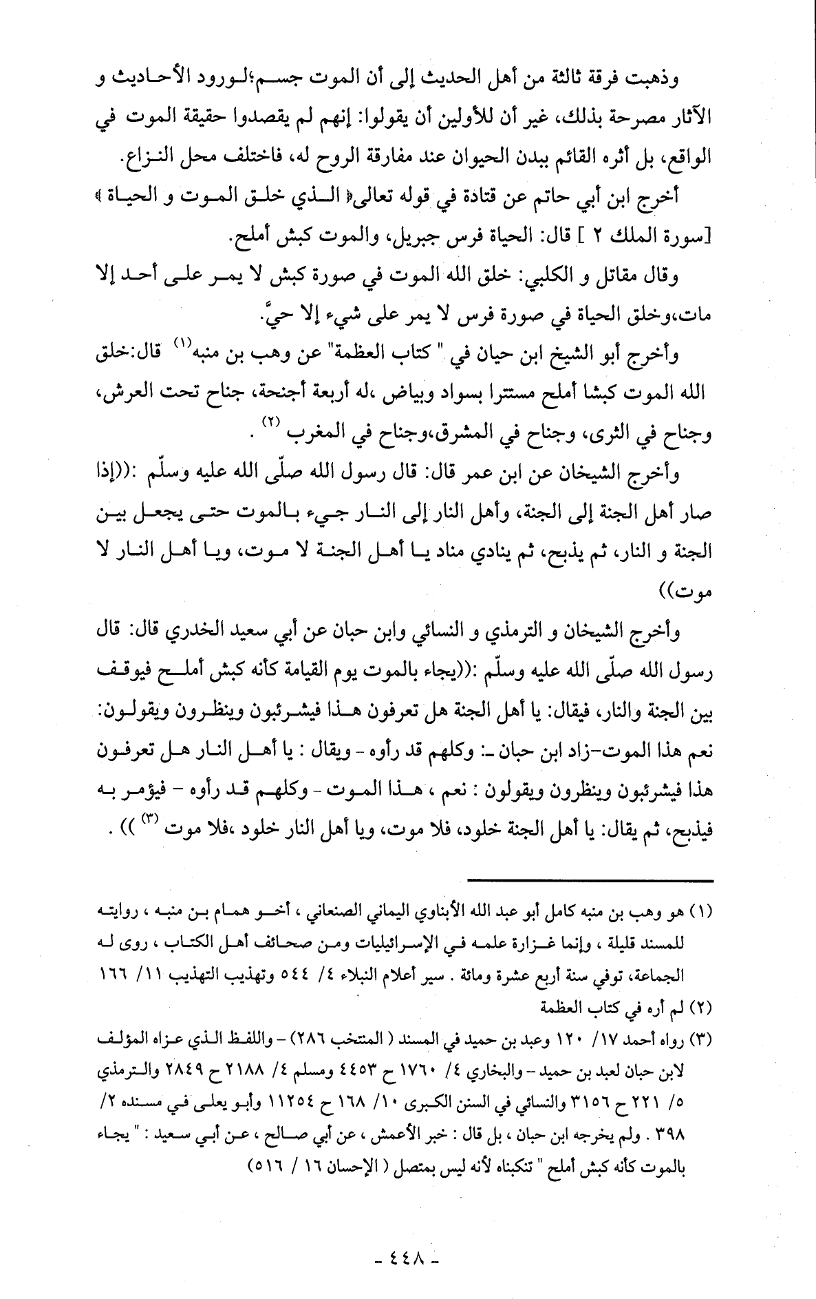 وأخرج أبو الشيخ ابن حيان في " كتاب العظمة " عن وهب بن منبه (1) قال: خلق الله الموت كبشا أملح مستترا بسواد وبياض، له أربعة أجنحة، جناح تحت العرش، وجناح في الثرى، وجناح في المشرق، وجناح في المغرب (2).