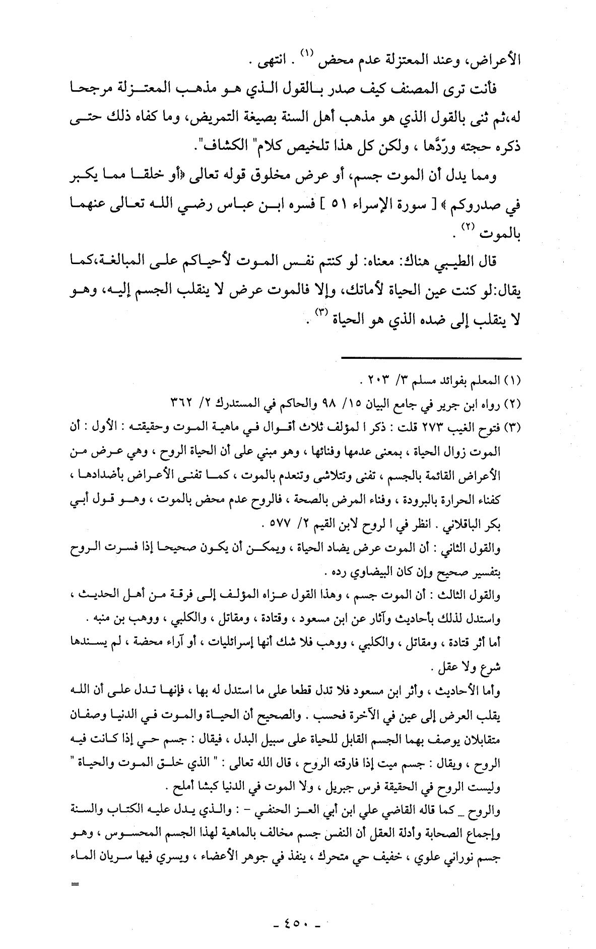 ومما يدل أن الموت جسم، أو عرض مخلوق قوله تعالى (أو خلقا مما يكبر في صدروكم) [سورة الإسراء 51] فسره ابن عباس رضي الله تعالى عنهما بالموت (2).