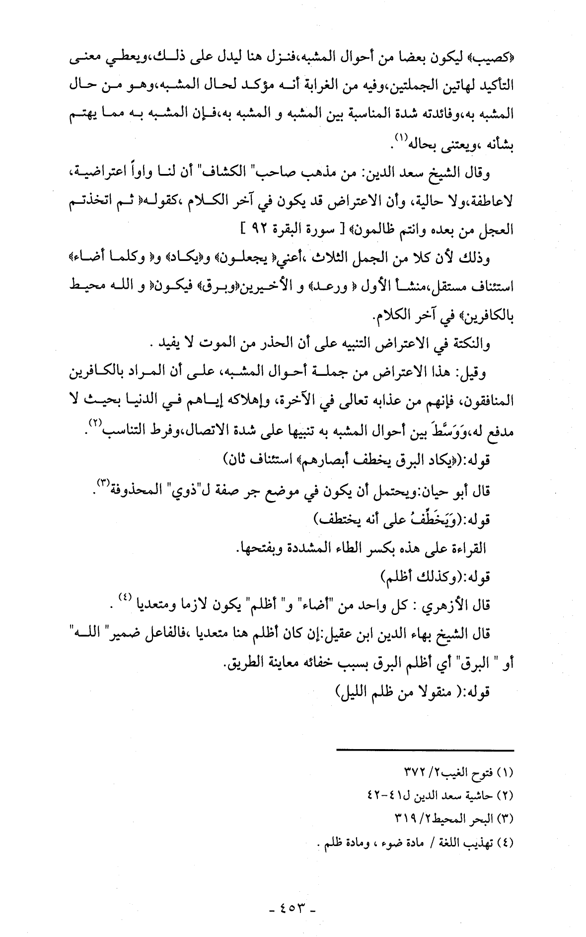وذلك لأن كلا من الجمل الثلاث، أعني (يجعلون) و (يكاد) و (كلما أضاء) استئناف مستقل، منشأ الأول (ورعد) والأخيرين (وبرق) فيكون (والله محيط بالكافرين) في آخر الكلام.