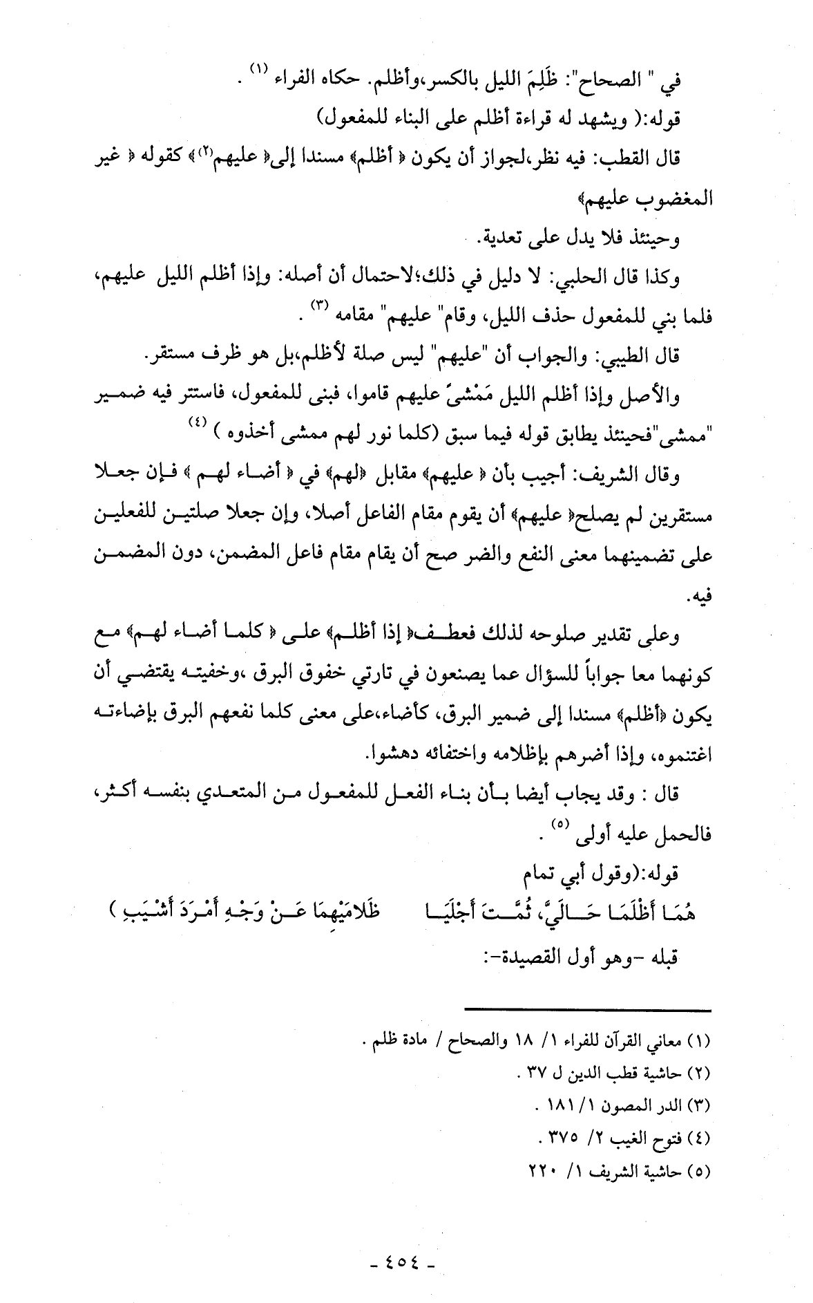 وكذا قال الحلبي: لا دليل في ذلك، لاحتمال أن أصله: وإذا أظلم الليل عليهم، فلما بني للمفعول حذف الليل، وقام " عليهم " مقامه (3).