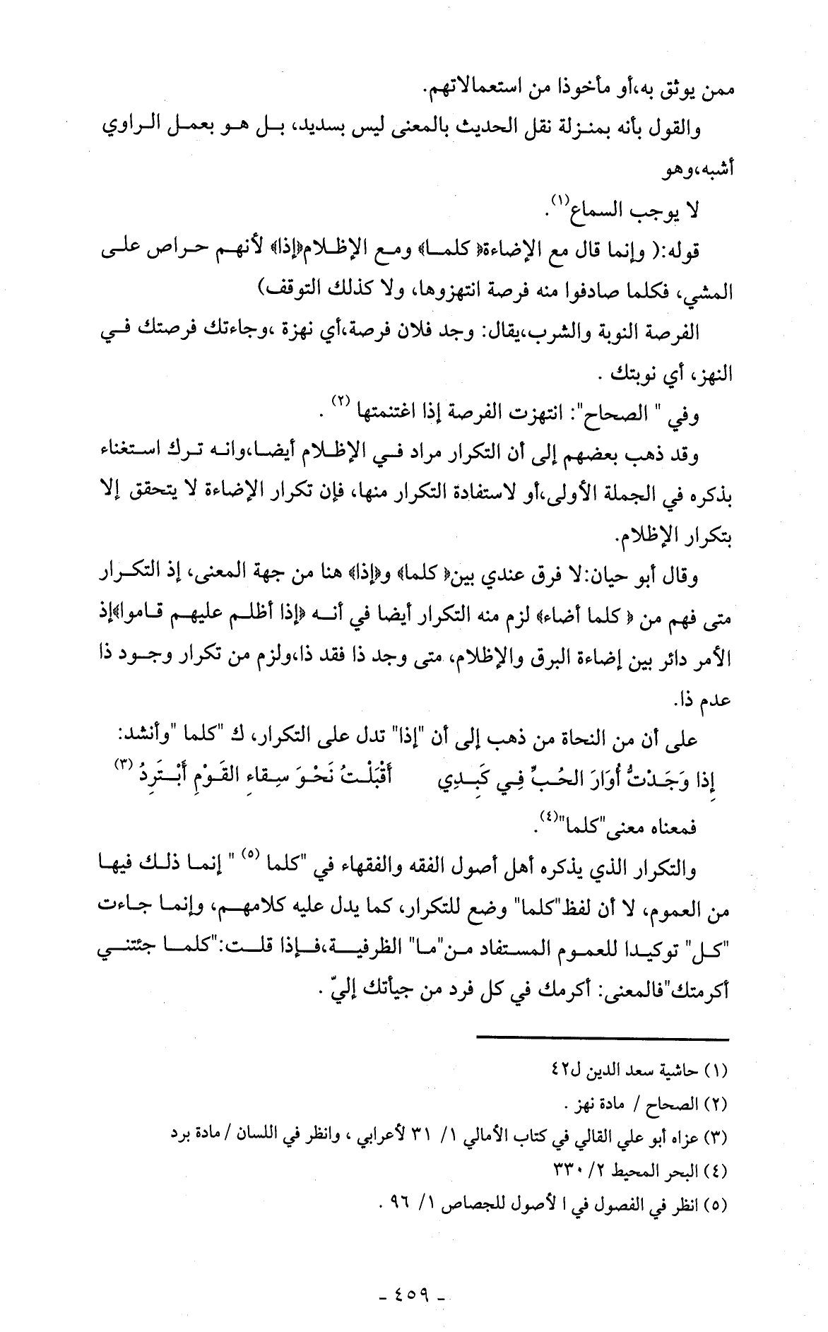 والتكرار الذي يذكره أهل أصول الفقه والفقهاء في " كلما (5) " إنما ذلك فيها من العموم، لا أن لفظ " كلما " وضع للتكرار، كما يدل عليه كلامهم، وإنما جاءت " كل " توكيدا للعموم المستفاد من " ما " الظرفية، فإذا قلت: " كلما جئتني أكرمتك " فالمعنى: أكرمك في كل فرد من جيأتك إليَّ.