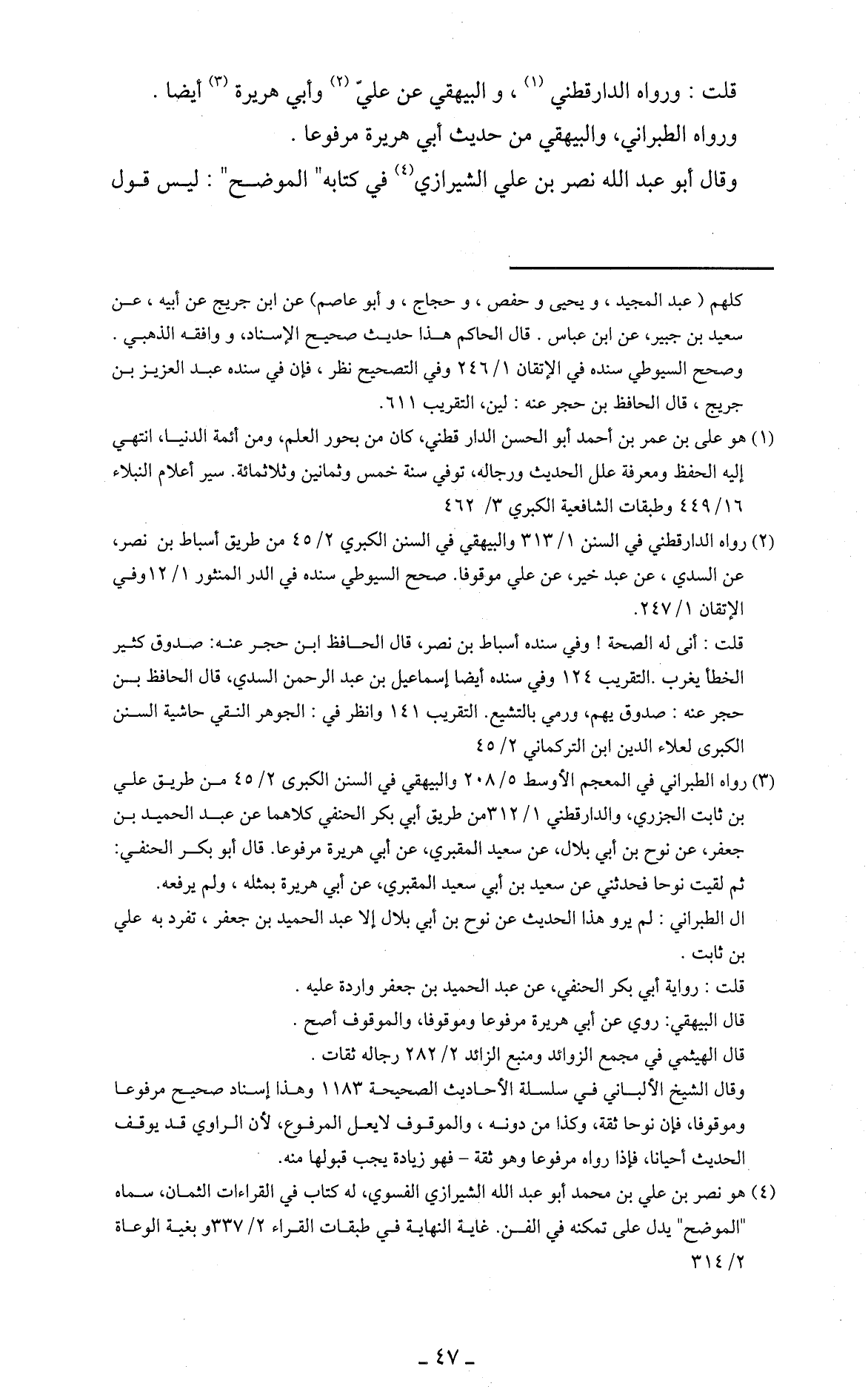 (3) رواه الطبراني في المعجم الأوسط 5/ 208 والبيهقي في السنن الكبرى 2/ 45 من طريق علي بن ثابت الجزري، والدارقطني 1/ 312 من طريق أبي بكر الحنفي كلاهما عن عبد الحميد بن جعفر، عن نوح بن أبي بلال، عن سعيد المقبري، عن أبي هريرة مرفوعا، قال أبو بكر الحنفي: ثم لقيت نوحا فحدثتني عن سعيد بن أبي سعيد المقبري، عن أبي هريرة بمثله، ولم يرفعه.
