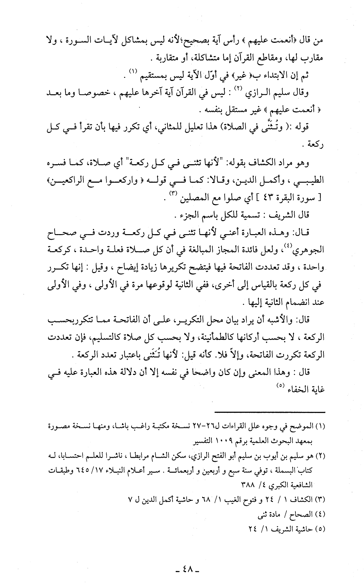 قال: وهذه العبارة أعني لأثها تثنى في كل ركعة وردت في صحاح الجوهري (4)، ولعل فائدة المجاز المبالغة في أن كل صلاة فعلة واحدة، ركعة واحدة، وقد تعددت الفاتحة فيها فيتضح تكريرها زيادة إيضاح، وقيل: إنها تكرر في كل ركعة بالقياس إلى أخرى، ففي الثانية لوقوعها مرة في الأولى، وفي الأولى عند انضمام الثانية إليها.