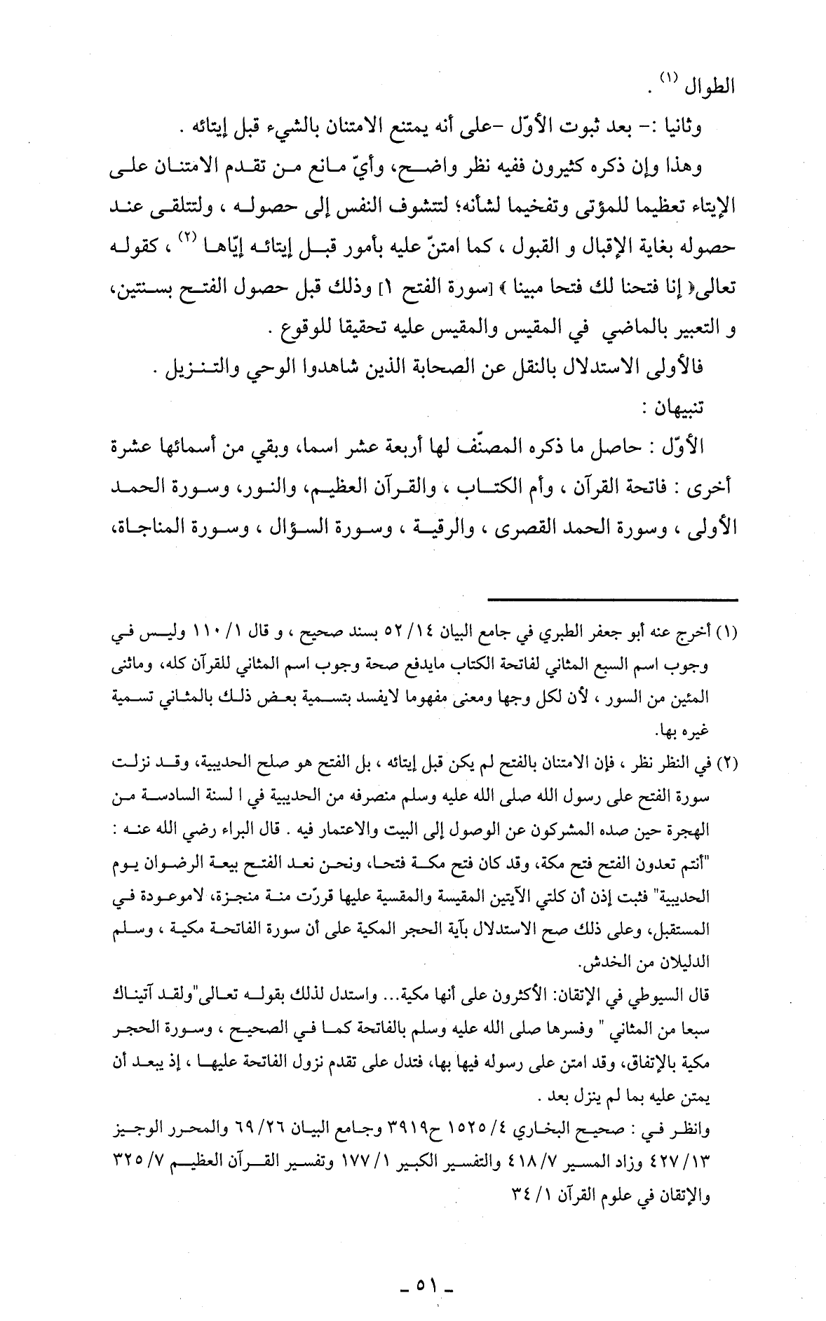 (2) في النظر نظر، فإن الامتنان بالفتح لم يكن قبل إيتائه، بل بل الفتح هو صلح الحديبية، وقد نزلت سورة الفتح على رسول الله - صلى الله عليه وسلم - منصرفه من الحديبية في السنة السادسة من الهجرة حين صده المشركون عن الوصول إلى البيت والاعتمار فيه. قال البراء - رضي الله عنه -: "أنتم تعدون الفتح فتح مكة، وقد كان فتح مكة فتحا، ونحن نعد الفتح بيعة الرضوان يوم الحديبية" فثبت إذن أن كلتي الآيتين المقيسة والمقسية عليها قرّرت منة منجزة، لا موعودة في المستقبل، وعلى ذلك صح الاستدلال بآية الحجر المكية على أن سورة الفاتحة مكية، وسلم الدليلان من الخدش.