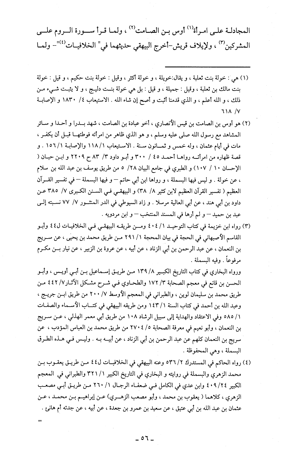 (2) هو أوس بن الصامت بن قيس الأنصاري، أخو عبادة بن الصامت، شهد بدرا وأحدا وسائر المشاهد مع رسول الله - صلى الله عليه وسلم -، وهو الذي ظاهر من امرأته فوطئها قبل أن يكفر، مات في أيام عثمان، وله خمس وثمانون سنة. الاستيعاب 1/ 118 والإصابة 1/ 156. وقصة ظهاره من امرأته رواها أحمد 45/ 300 وأبو داود 3/ 83 ح 2209 وابن حبان (الإحسان 10/ 107) والطبري في جامع البيان 28/ 5 من طريق يوسف بن عبد الله بن سلام، عن خولة. وليس فيها البسملة، ورواها ابن أبي حاتم -وفيها البسملة- في تفسير القرآن العظيم (تفسير القرآن العظيم لابن كثير 8/ 38) والبيهقي في السنن الكبرى 7/ 385 عن داود بن أبي هند، عن أبي العالية مرسلاً. وزاد السيوطي في الدر المنثور 7/ 77 نسبته إلى عبد بن حميد -ولم أرها في المسند المنتخب- وابن مردويه.