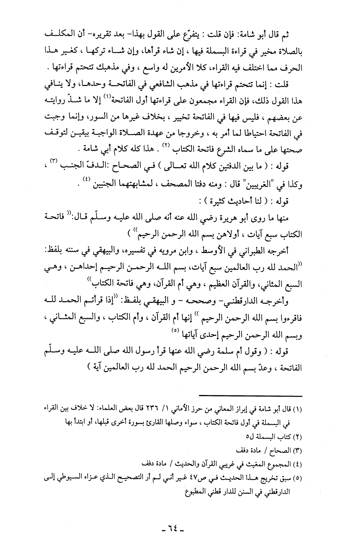 قلت: إنما تتحتم قراءتها في مذهب الشافعي في الفاتحة وحدها، ولا ينافي هذا القول ذلك، فإن القراء مجمعون على قراءتها أول الفاتحة (1) إلا ما شذّ روايته عن بعضهم، فليس فيها في الفاتحة تخيير، بخلاف غيرها من السور، وإنما وجبت في الفاتحة احتياطا لما أمر به، وخروجا من عهدة الصلاة الواجبة بيقين لتوقف صحتها على ما سماه الشرع فاتحة الكتاب (2). هذا كله كلام أبي شامة.