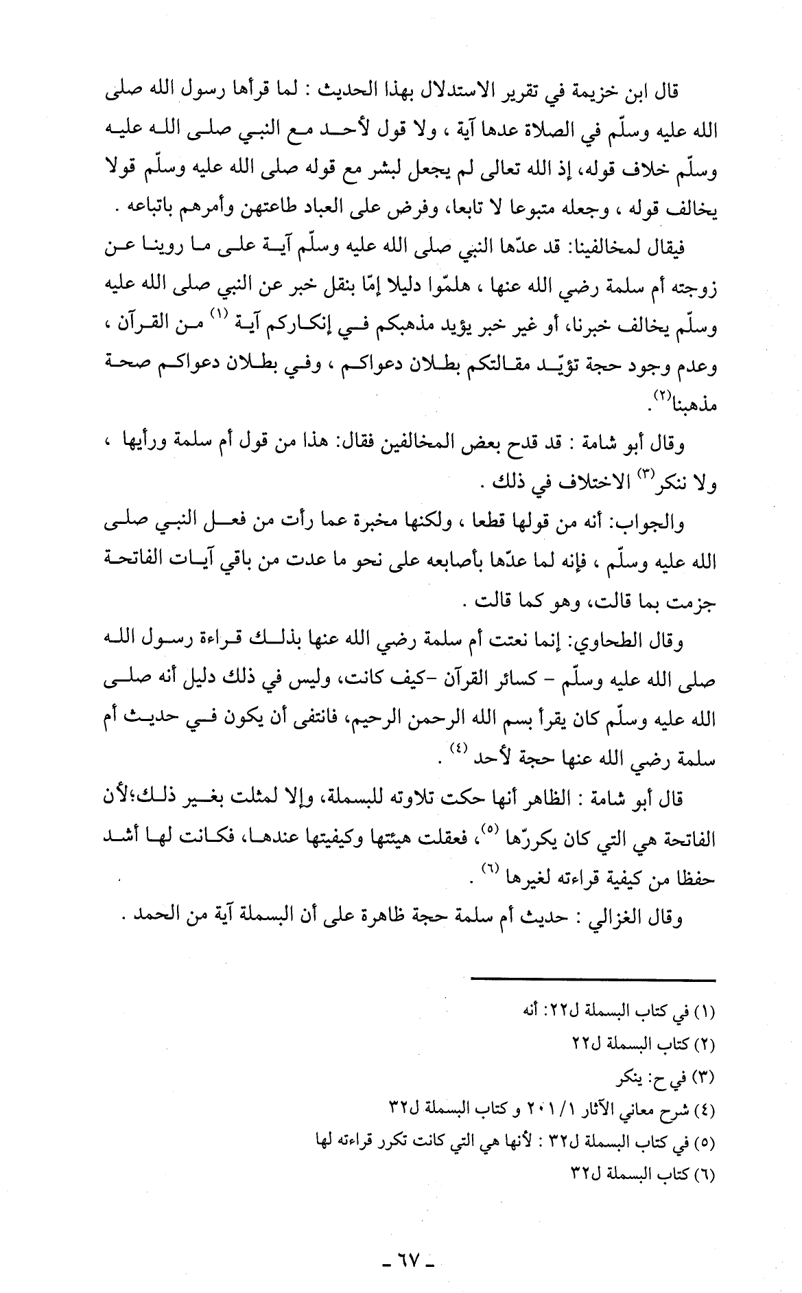 وقال الطحاوي: إنما نعتت أم سلمة رضي الله عنها بذلك قراءة رسول الله صلى الله عليه وسلّم -كسائر القرآن- كيف كانت، وليس في ذلك دليل أنه صلى الله عليه وسلّم كان يقرأ بِسْمِ اللَّهِ الرَّحْمَنِ الرَّحِيمِ، فانتفى أن يكون في حديث أم سلمة رضي الله عنها حجة لأحد (4).