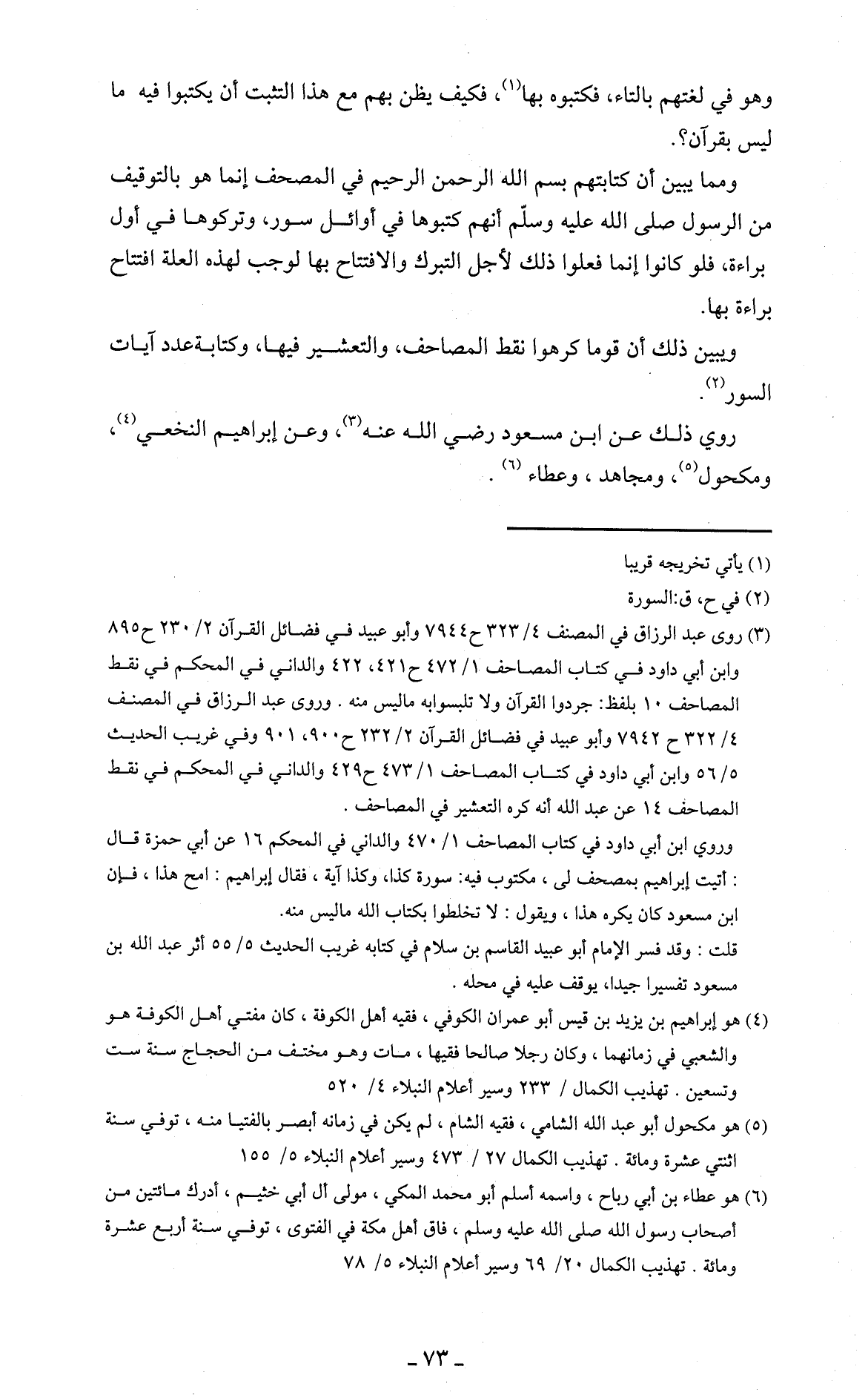 (3) روى عبد الرزاق في المصنف 4/ 323 ح7944 وأبو عبيد في فضائل القرآن 2/ 230 ح895 وابن أبي داود في كتاب المصاحف 1/ 472 ح421، 422 والداني في المحكم في نقط المصاحف 10 بلفظ: جردوا القرآن ولا تلبسوا به ما ليس منه. وروى عبد الرزاق في المصنف 4/ 322 ح7942 وأبو عبيد في فضائل القرآن 2/ 232 ح900، 901 وفي غريب الحديث 5/ 56 وابن أبي داود في كتاب المصاحف 1/ 473 ح429 والداني في المحكم في نقط المصاحف 14 عن عبد الله أنه كره التعشير في المصاحف.
