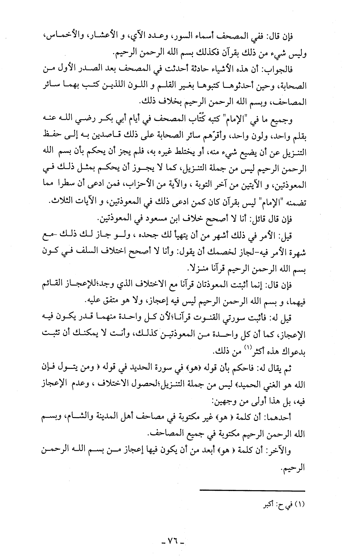 وجميع ما في " الإمام " كتبه كُتّاب المصحف في أيام أبي بكر رضي الله عنه بقلم واحد، ولون واحد، وأقرّهم سائر الصحابة على ذلك قاصدين به إلى حفظ التنزيل عن أن يضيع شيء منه، أو يختلط غيره به، فلم يجز أن يحكم بأن بِسْمِ اللَّهِ الرَّحْمَنِ الرَّحِيمِ ليس من جملة التنزيل، كما لا يجوز أن يحكم بمثل ذلك في المعوذتين، والآيتين من آخر التوبة، والآية من الأحزاب، فمن ادعى أن سطرا مما تضمنه " الإمام " ليس بقرآن كان كمن ادعى ذلك في المعوذتين، والآيات الثلاث.