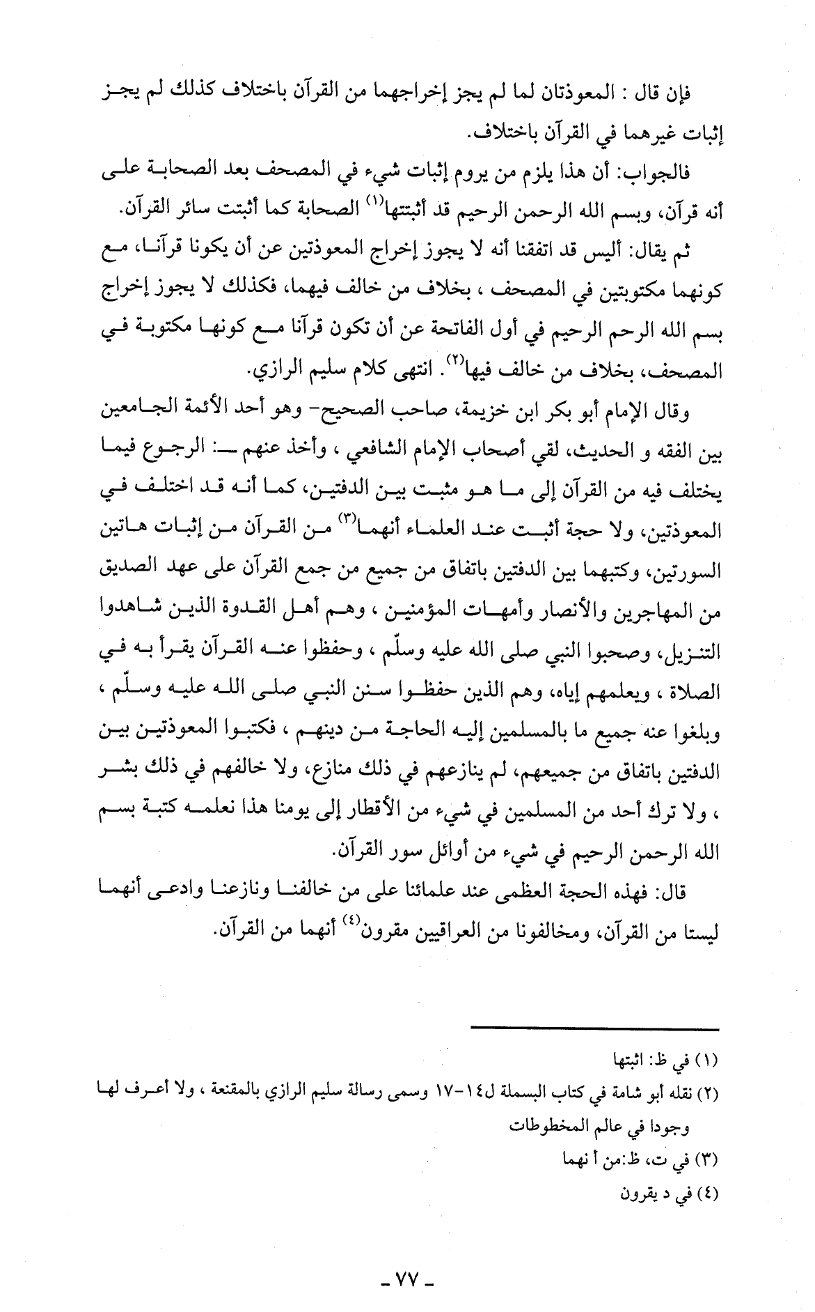 وقال الإمام أبو بكر ابن خزيمة، صاحب الصحيح -وهو أحد الأئمة الجامعين بين الفقه والحديث، لقي أصحاب الإمام الشافعي، وأخد عنهم-: الرجوع فيما يختلف فيه من القرآن إلى ما هو مثبت بين الدفتين، كما أنه قد اختلف في المعوذتين، ولا حجة أثبت عند العلماء أنهما (3) من القرآن من إثبات هاتين السورتين، وكتبهما بين الدفتين باتفاق من جميع من جمع القرآن على عهد الصديق من المهاجرين والأنصار وأمهات المؤمنين، وهم أهل القدوة الذين شاهدوا التنزيل، وصحبوا النبي صلى الله عليه وسلّم، وحفظوا عنه القرآن يقرأ به في الصلاة، ويعلمهم إياه، وهم الذين حفظوا سنن النبي صلى الله عليه وسلّم، وبلغوا عنه جميع ما بالمسلمين إليه الحاجة من دينهم، فكتبوا المعوذتين بين الدفتين باتفاق من جميعهم، لم ينازعهم في ذلك منازع، ولا خالفهم في ذلك بشر، ولا ترك أحد من المسلمين في شيء من الأقطار إلى يومنا هذا نعلمه كتبة بِسْمِ اللَّهِ الرَّحْمَنِ الرَّحِيمِ في شيء من أوائل سور القرآن.