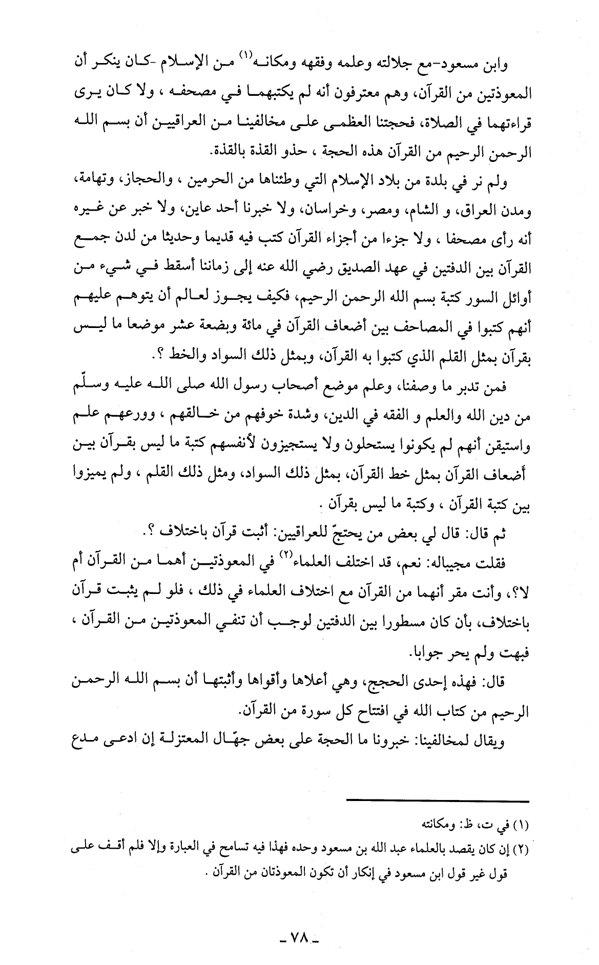 وابن مسعود - مع جلالته وعلمه وفقهه ومكانه (1) من الإسلام - كان ينكر أن المعوذتين من القرآن، وهم معترفون أنه لم يكتبهما في مصحفه، ولا كان يرى قراءتهما في الصلاة، فحجتنا العظمى على مخالفينا من العراقيين أن بِسْمِ اللَّهِ الرَّحْمَنِ الرَّحِيمِ من القرآن هذه الحجة، حذو القذة بالقذة.
