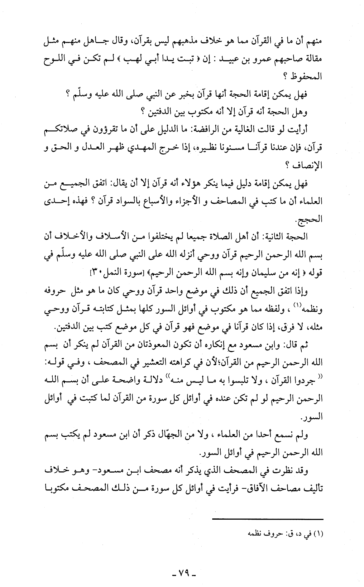 ثم قال: وابن مسعود مع إنكاره أن تكون المعوذتان من القرآن لم ينكر أن بِسْمِ اللَّهِ الرَّحْمَنِ الرَّحِيمِ من القرآن؛ لأن في كراهته التعشير في المصحف، وفي قوله: " جردوا القرآن، ولا تلبسوا به ما ليس منه " دلالة واضحة على أن بِسْمِ اللَّهِ الرَّحْمَنِ الرَّحِيمِ لو لم تكن عنده في أوائل كل سورة من القرآن لما كتبت في أوائل السور.