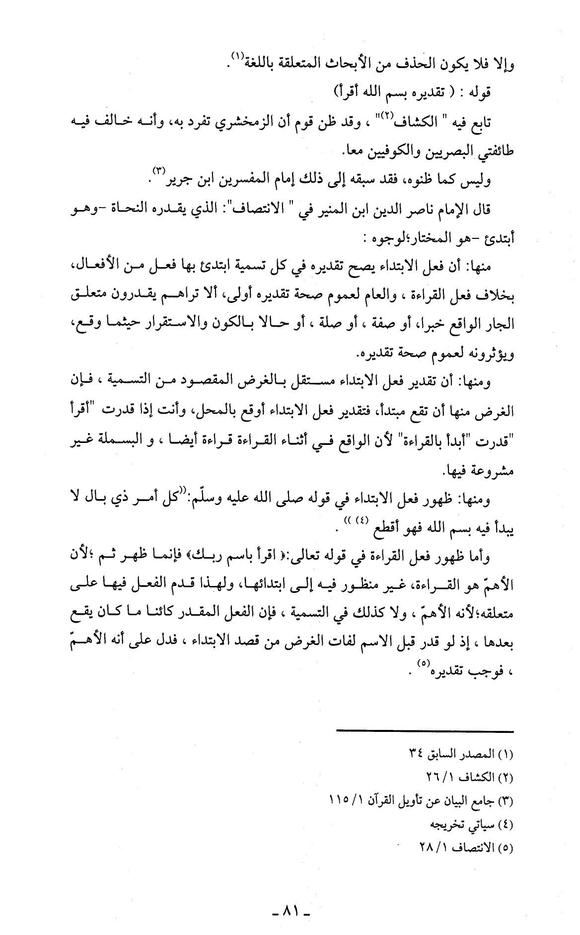 وأما ظهور فعل القراءة في قوله تعالى: (اقرأ باسم ربك) فإنما ظهر ثم؛ لأن الأهمّ هو القراءة، غير منظور فيه إلى ابتدائها، ولهذا قدم الفعل فيها على متعلقه؛ لأنه الأهمّ، ولا كذلك في التسمية، فإن الفعل المقدر كائنا ما كان يقع بعدها، إذ لو قدر قبل الاسم لفات الغرض من قصد الابتداء، فدل على أنه الأهمّ، فوجب تقديره (5).