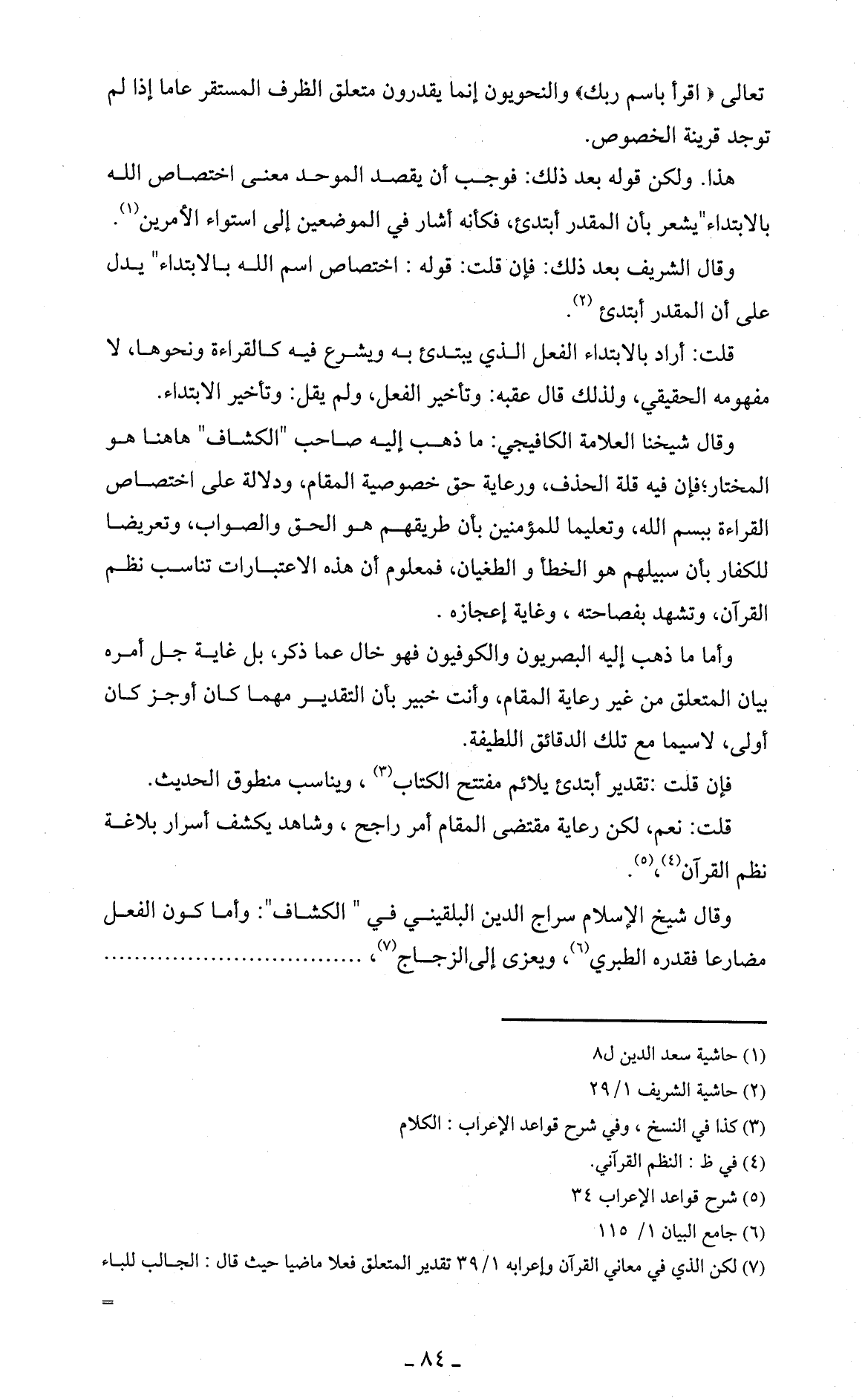 وقال شيخنا العلامة الكافيجي: ما ذهب إليه صاحب " الكشاف " هاهنا هو المختار، فإن فيه قلة الحذف، ورعاية حق خصوصية المقام، ودلالة على اختصاص القراءة ببسم الله، وتعليما للمؤمنين بأن طريقهم هو الحق والصواب، وتعريضا للكفار بأن سبيلهم هو الخطأ والطغيان، فمعلوم أن هذه الاعتبارات تناسب نظم القرآن، وتشهد بفصاحته، وغاية إعجازه.