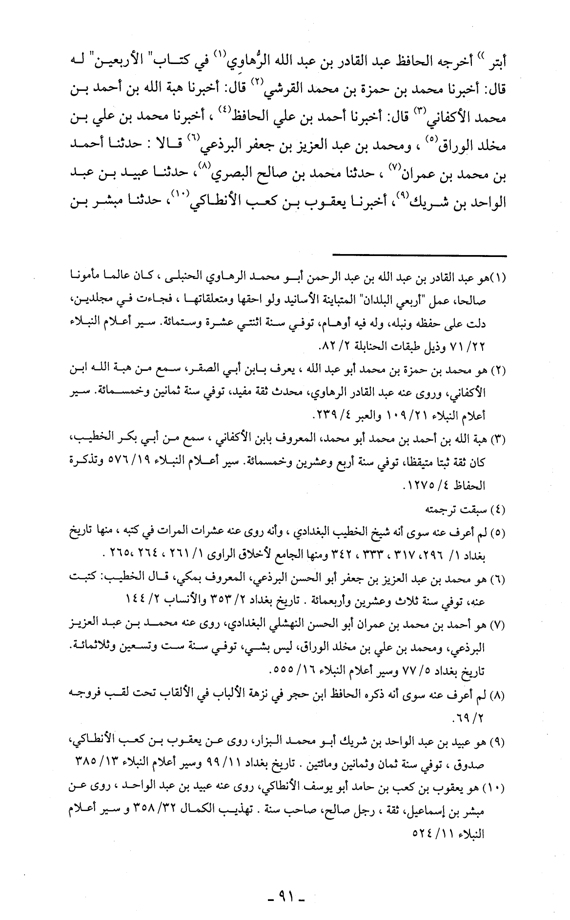 (1) هو عبد القادر بن عبد الله بن عبد الرحمن أبو محمد الرهاوي الحنبلي، كان عالما مأمونا صالحا، عمل "أربعي البلدان" المتباينة الأسانيد ولو أحقها ومتعلقاتها، فجاءت في مجلدين، دلت على حفظه ونبله، وله فيه أوهام، توفي سنة اثنتي عشرة وستمائة. سير أعلام النبلاء 22/ 71 وذيل طبقات الحنابلة 2/ 82.