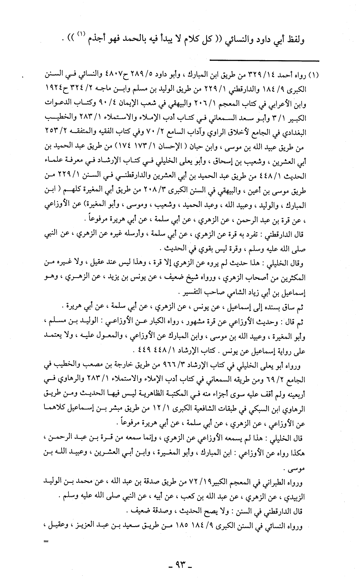 ولفظ أبي داود والنسائي " كل كلام لا يبدأ فيه بالحمد فهو أجذم " (1).