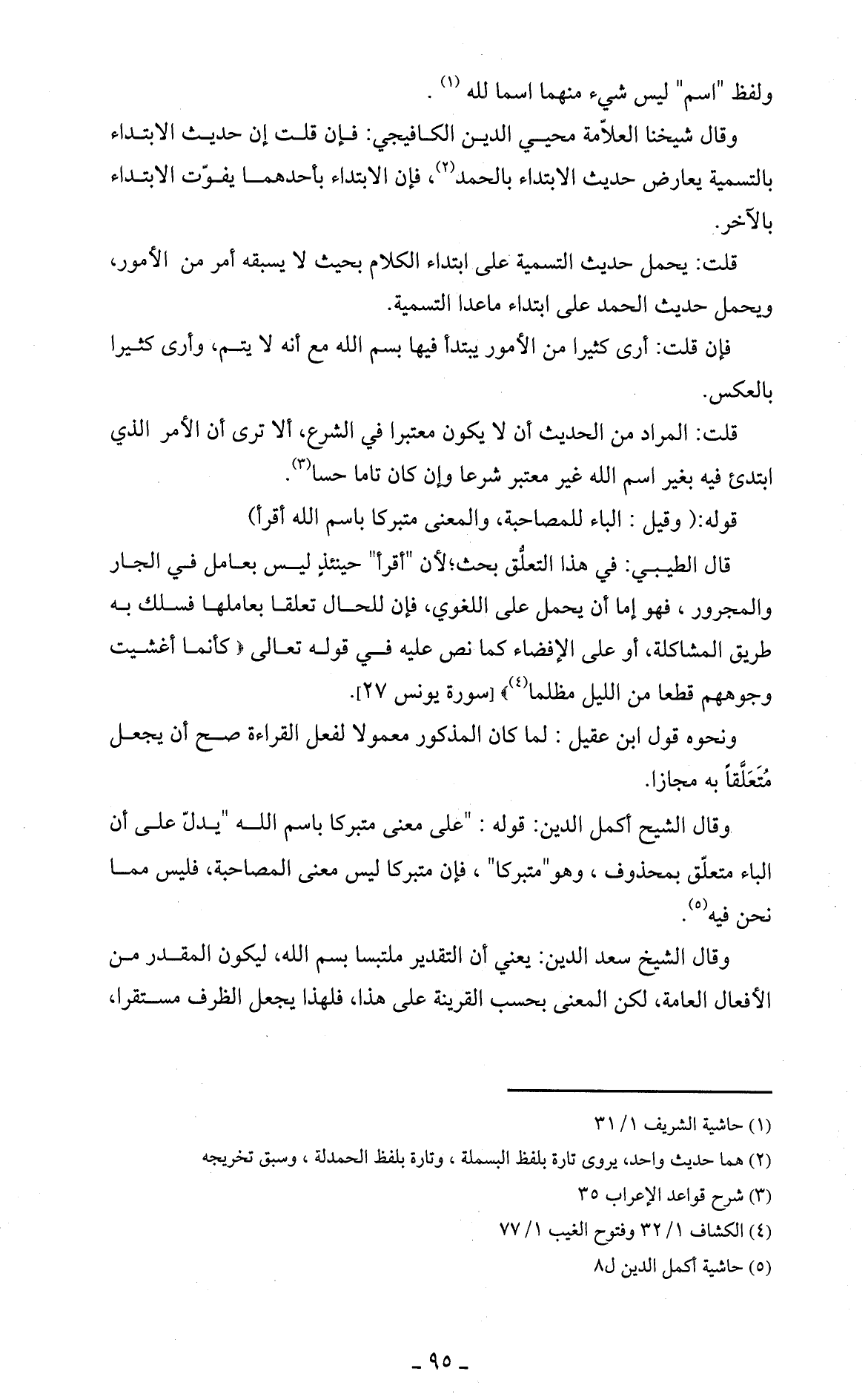 وقال شيخنا العلاّمة محيي الدين الكافيجي: فإن قلت إن حديث الابتداء بالتسمية يعارض حديث الابتداء بالحمد (2)، فإن الابتداء بأحدهما يفوّت الابتداء بالآخر.