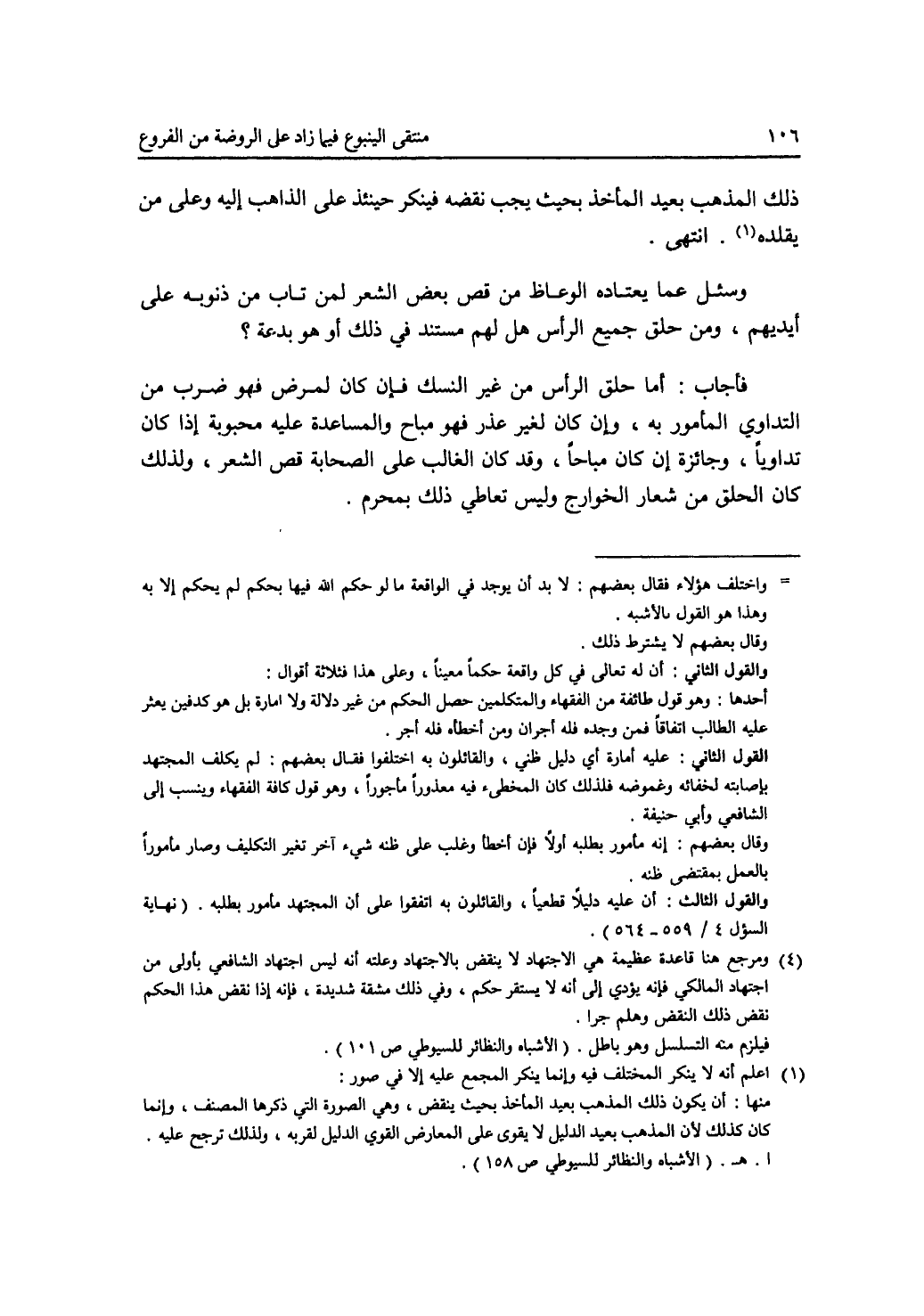 ذلك المذهب بعيد المأخوذ بحيث يجب نفضه فينكر حينئذ على الذاهب إليه وعلى من يقلده (1). انتهى. وسئل عما يعتاده الوعاظ من قص بعض الشعر لمن تاب من ذنوبه على أيديهم، ومن حلق جميع الرأس هل لهم مستند في ذلك أو هو بدعة ؟ فأجاب: أما خلق الرأس من غير النسك فإن كان لمرض فهو ضرب من التداوي المأمور به، وإن كان لغير عذر فهو مباح والمساعدة عليه محبوبة إذا كان تداويا، وجائزة إن كان مباحا، وقد كان الغالب على الصحابة قصا الشعر، ولذلك كان الحلق من شعار الخوارج وليس تعاطي ذلك بمحرم.