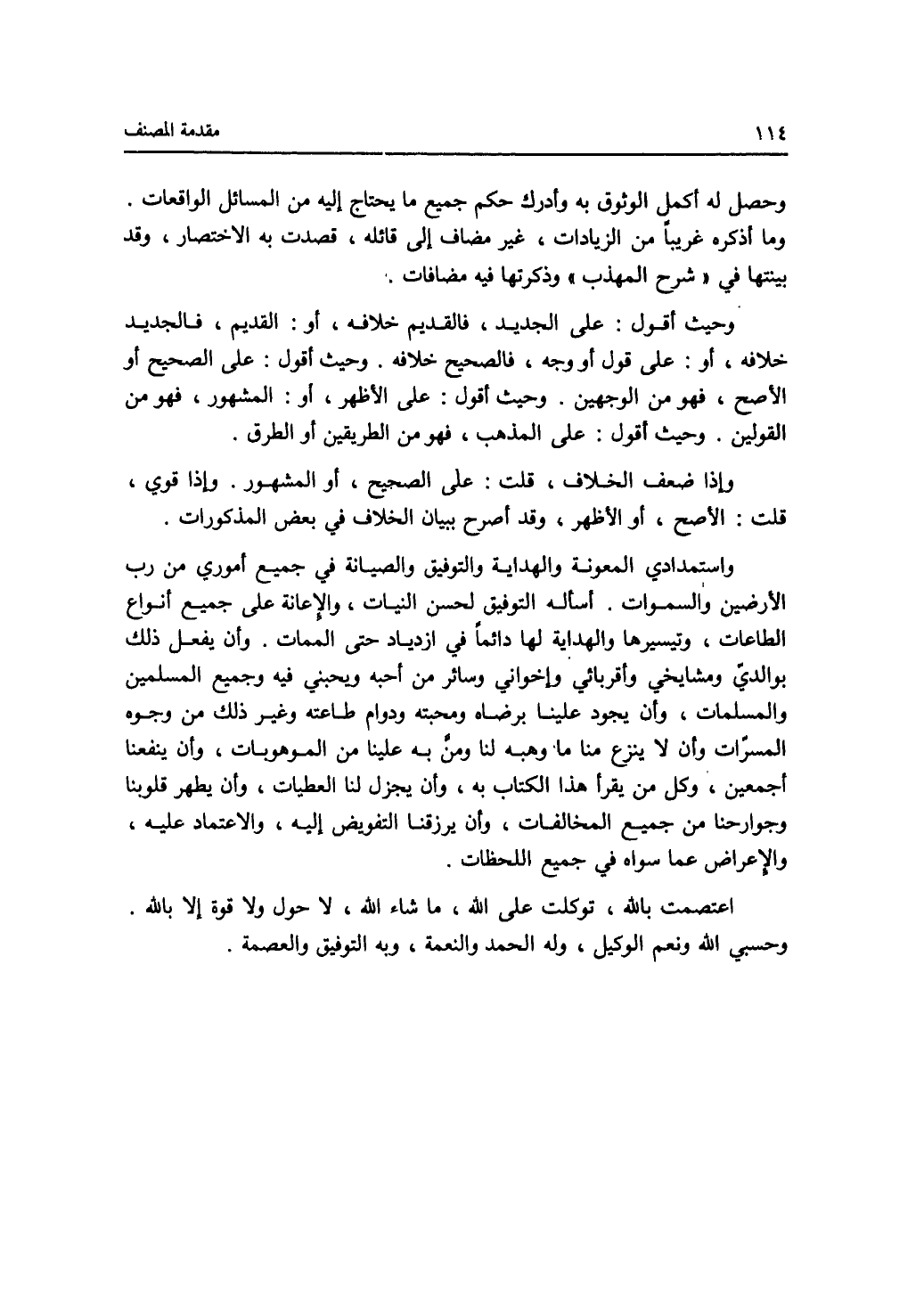 وحصل له أكمل الوثوق به أدرك حكم جميع ما يحتاج إليه من المسائل الواقعات. وما أكره غريبا من الزيادات، غير مضاف إلى قائله، قصدت به الاختصار، وقد بينتها في (شرح المهذب) وذكرتها فيه مضافات. وحيث أقول: على الجديد، فالقديم خلافه، أو: القديم، فالجديد خلافه، أو: على قول أو وجه، فالصحيح خلافه. وحيث أقول: على الصحيح أو الاصح، فهو من الوجهين. وحيث أقول: على الاظهر، أو: المشهور، فهو من القولين. وحيث أقول: على المذهب، فهو من الطريقين أو الطرق. وإذا ضعف الخلاف، قلت: على الصحيح، أو المشهور. وإذا قوي، قلت: الاصح، أو الاظهر، وقد أصرح ببيان الخلاف في بعض المذكورات. واستمدادي المعونة والهداية والتوفيق والصيانة في جميع أموري من رب الارضين والسموات. أسأله التوفيق لحسن النيات، الاعانة على جميع أنواع الطاعات. وتيسيرها والهداية لها دائما في ازدياد حتى الممات. وأن يفعل ذلك بوالدي ومشايخي وأقربائي وإخواني وسائر من أحبه ويحبني فيه وجميع المسلمين والمسلمات، وأن يجود علينا برضاه ومحبته ودوام طاعته وغير ذلك من وجوه المسرات وأن لا ينزع منا ما وهبه لنا ومن به علينا من الموهوبات، من وجوه أجمعين، وكل من يقرأ هذا الكتاب به، وأن يجزان لنا العطيات، وأن يطهر قوبنا والاعراض عما سواه في جميع اللحظات. اعتصمت بالله، توكلت على الله، ما شاء الله، لا حول ولا قوة إلا بالله. وحسبي الله ونعم الوكيل، وله الحمد والنعمة، وبه التوفيق والعصمة.
