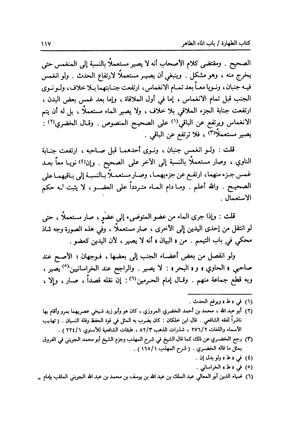الصحيح. ومقتضى كلام الاصحاب أنه لا يصير مستعملا بالنسبة إلى المنغمس حتى يخرج منه، وهو مشكل. وينبغي أن يصير مستعملا لارتفاع الحدث. ولو انغمس فيه جنبان، ونويا معا بعد تمام الانغماس، ارتفعت جنابتهما بلا خلاف، ولو نوى الجنب قبل تمام الانغماس، إما في أول الملاقاة، وإما بعد غمس بعض البدن، ارتفعت جنابة الجزء الملاقي بلا خلاف، ولا يصير الماء مستعملا، بل له أن يتم الانغماس ويرتفع عن الباقي (1) على الصحيح المنصوص. وقال الخضري (2): يصير مستعملا، (3) فلا ترتفع عن الباقي. قلت: ولو انغمس جنبان، ونوى أحدهما قبل صاحبه، ارتفعت جنابة الناوي، وصار مستعملا بالنسبة إلى الآخر على الصحيح. وإن (4) نويا معا بعد غمس جزء منهما، ارتفع عن جزءيهما، وصار مستعملا بالنسبة إلى باقيهما على الصحيح. والله أعلم. وما دام الماء مترددا على العضو، لا يثبت له حكم الاستعمال. قلت: وإذا جرى الماء من عضو المتوضئ إلى عضو، صار مستعملا، حتى لو انتقل من إحدى اليدين إلى الاخرى، صار مستعملا، وفي هذه الصورة وجه شاذ محكي في باب التيمم. من (البيان) أنه لا يصير، لان اليدين كعضو. ولو انفصل من بعض أعضاء الجنب إلى بعضها، فوجهان، الاصح عند صاحبي (الحاوي) و (البحر): لا يصير. والراجح عند الخراسانيين (5) يصير، وبه قطع جماعة منهم. وقال إمام الحرمين (6): إن نقله قصدا، صار، وإلا،