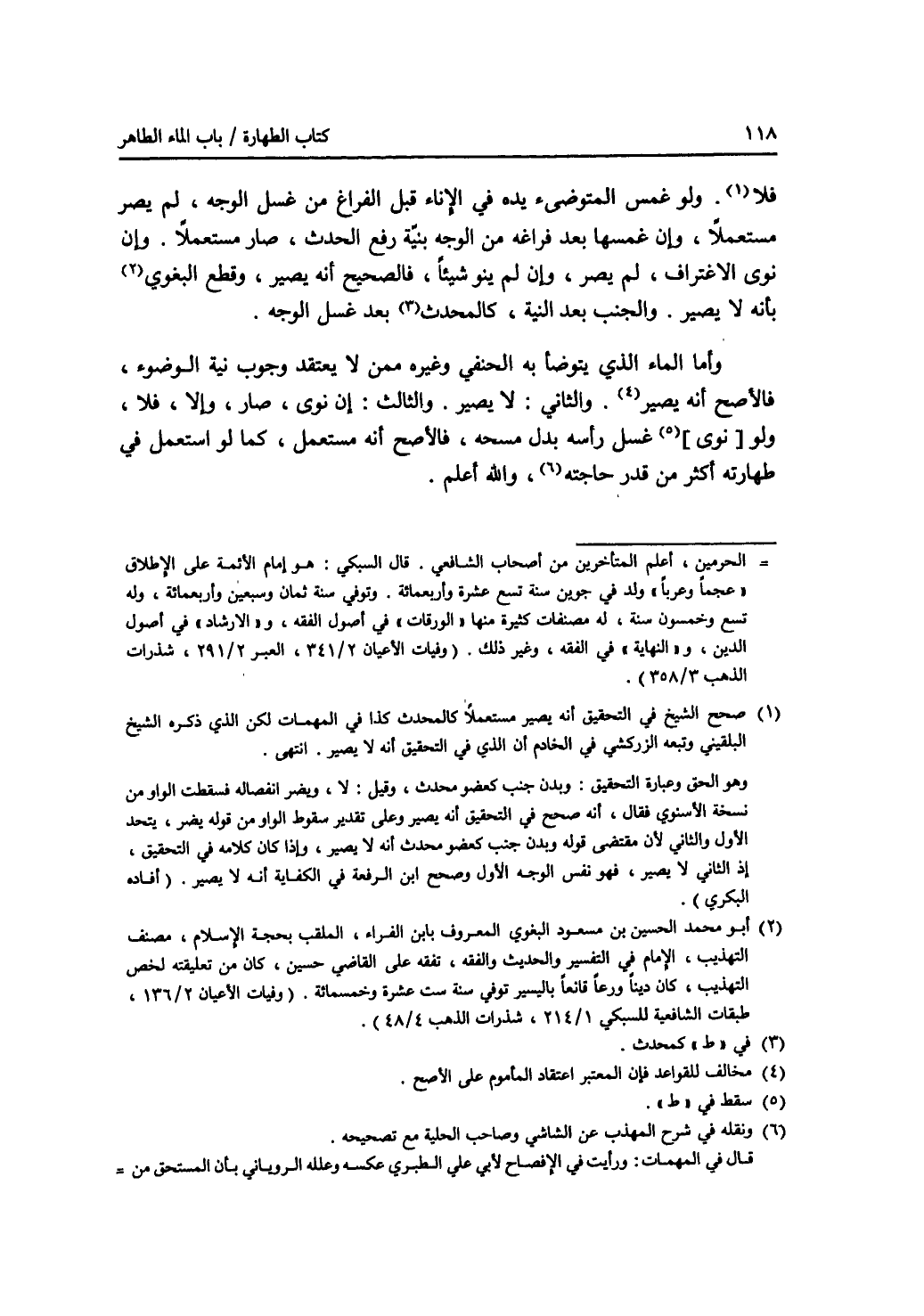فلا (1). ولو غمس المتوضئ يده في الاناء قبل الفراغ من غسل الوجه، لم يصر مستعملا. وإن غمسها بعد فراغه من الوجه بنية رفع الحدث، صار مستعملا. وإن نوى الاغتراف، لم يصر، وإن لم ينو شيئا، فالصحيح أنه يصير، وقطع البغوي (2) بأنه لا يصير. والجنب بعد النية، كالمحدث (3) بعد غسل الوجه. وأما الماء الذي يتوضأ به الحنفي وغيره ممن لا يعتقد وجوب نية الوضوء، فالاصح أنه يصير (4). والثاني: لا يصير. والثالث: إن نوى، صار، وإلا، فلا، ولو [ نوى ] (5) غسل رأسه بدل مسحه، فالاصح أنه مستعمل، كما لو استعمل في طهارته أكثر من قدر حاجته (6)، والله أعلم.