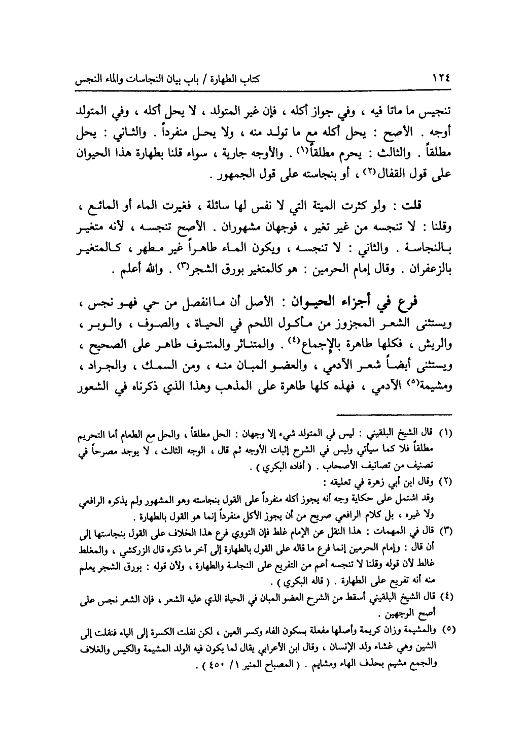 تنجيس ما ماتا فيه، وفي جواز أكله، فإن غير المتولد، لا يحل أكله، وفي المتولد أوجه. الاصح: يحل أكله مع ما تولد منه، ولا يحل منفردا. والثاني: يحل مطلقا. والثالث: يحرم مطلقا (1). والاوجه جارية، سواء قلنا بطهارة هذا الحيوان على قول القفال (2)، أو بنجاسته على قول الجمهور. قلت: ولو كثرت الميتة التي لا نفس لها سائلة، فغيرت الماء أو المائع، وقلنا: لا تنجسه من غير تغير، فوجهان مشهوران. الاصح تنجسه، لانه متغير بالنجاسة. والثاني: لا تنجسه، ويكون الماء طاهرا غير مطهر، كالمتغير بالزعفران. وقال إمام الحرمين: هو كالمتغير بورق الشجر (3). والله أعلم. فرع في أجزاء الحيوان: الاصل أن ما انفصل من حي فهو نجس، ويستثنى الشعر المجزوز من مأكول اللحم في الحياة، والصوف، والوبر، والريش، فكلها طاهرة بالاجماع (4). والمتناثر والمنتوف طاهر على الصحيح، ويستثنى أيضا شعر الآدمي، والعضو المبان منه، ومن السمك، والجراد، ومشيمة (5) الآدمي، فهذه كلها طاهرة على المذهب وهذا الذي ذكرناه في الشعور