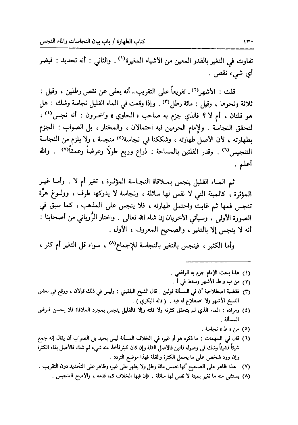 تفاوت في التغير بالقدر المعين من الاشياء المغيرة (1). والثاني: أنه تحديد: فيضر أي شئ نقص. قلت: الاشهر (2) - تفريعا على التقريب - أنه يعفى عن نقص رطلين، وقيل: ثلاثة ونحوها، وقيل: مائة رطل (3). وإذا وقعت في الماء القليل نجاسة وشك: هل هو قلتان، أم لا ؟ فالذي جزم به صاحب (الحاوي) وآخرون: أنه نجس (4)، لتحقق النجاسة. ولامام الحرمين فيه احتمالان، والمختار، بل الصواب: الجزم بطهارته، لان الاصل طهارته، وشككنا في نجاسة (5) منجسة، ولا يلزم من النجاسة التنجيس (6). وقدر القلتين بالمساحة: ذراع وربع طولا وعرضا وعمقا (7). والله أعلم. ثم الماء القليل ينجس بملاقاة النجاسة المؤثرة، تغير أم لا. وأما غير المؤثرة، كالميتة التي لا نفس لها سائلة، ونجاسة لا يدركها طرف، وولوغ هرة تنجس فمها ثم غابت واحتمل طهارته، فلا ينجس على المذهب، كما سبق في الصورة الاولى، وسيأتي الاخريان إن شاء الله تعالى. واختار الروياني من أصحابنا: أنه لا ينجس إلا بالتغير، والصحيح المعروف، الاول. وأما الكثير، فينجس بالتغير بالنجاسة للاجماع (8)، سواء قل التغير أم كثر،