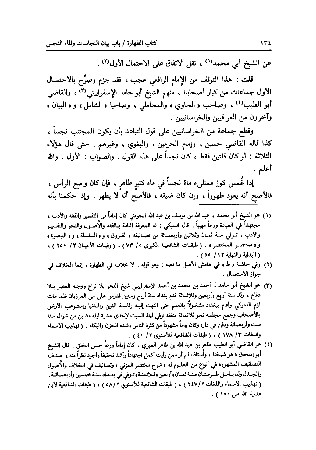عن الشيخ أبي محمد (1)، نقل الاتفاق على الاحتمال الاول (2). قلت: هذا التوقف من الامام الرافعي عجب، فقد جزم وصرح بالاحتمال الاول جماعات من كبار أصحابنا، منهم الشيخ أبو حامد الاسفراييني (3)، والقاضي أبو الطيب (4)، وصاحب (الحاوي) والمحاملي، وصاحبا (الشامل) و (البيان) وآخرون من العراقيين والخراسانيين. وقطع جماعة من الخراسانيين على قول التباعد بأن يكون المجتنب نجسا، كذا قاله القاضي حسين، وإمام الحرمين، والبغوي، وغيرهم. حتى قال هؤلاء الثلاثة: لو كان قلتين فقط، كان نجسا على هذا القول. والصواب: الاول. والله أعلم. إذا غمس كوز ممتلئ ماء نجسا في ماء كثير طاهر، فإن كان واسع الرأس، فالاصح أنه يعود طهورا، وإن كان ضيقه، فالاصح أنه لا يطهر. وإذا حكمنا بأنه
