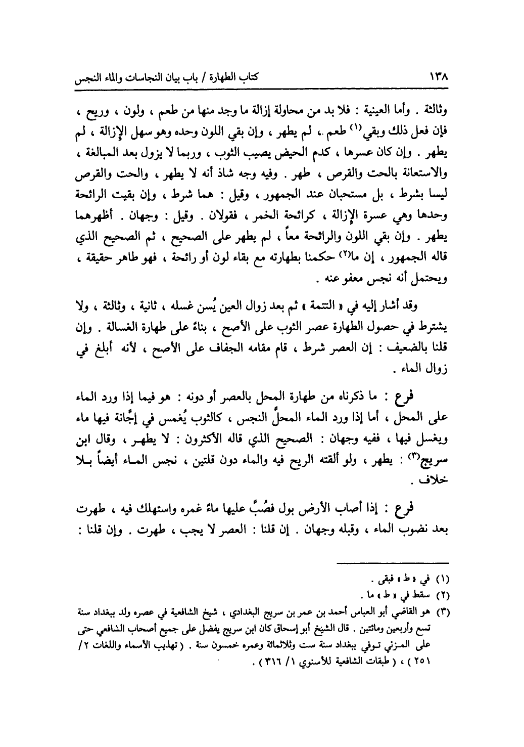 وثالثة. وأما العينية: فلا بد من محاولة إزالة ما وجد منها من طعم، ولون، وريح، فان فعل ذلك فبقي (1) طعم، لم يطهر، وإن بقي اللون وحده وهو سهل الازالة، لم يطهر. وإن كان عسرها، كدم الحيض يصيب الثوب، وربما لا يزول بعد المبالغة، والاستعانة بالحت والقرص، طهر. وفيه وجه شاذ أنه لا يطهر، والحت والقرص ليسا بشرط، بل مستحبان عند الجمهور، وقيل: هما شرط، وإن بقيت الرائحة وحدها وهي عسرة الازالة، كرائحة الخمر، فقولان. وقيل: وجهان. أظهرهما يطهر. وإن بقي اللون والرائحة معا، لم يطهر على الصحيح، ثم الصحيح الذي قاله الجمهور، إن ما (2) حكمنا بطهارته مع بقاء لون أو رائحة، فهو طاهر حقيقة، ويحتمل أنه نجس معفو عنه. وقد أشار إليه في (التتمة) ثم بعد زوال العين يسن غسله، ثانية، وثالثة، ولا يشترط في حصول الطهارة عصر الثوب على الاصح، بناء على طهارة الغسالة. وإن قلنا بالضعيف: إن العصر شرط، قام مقامه الجفاف على الاصح، لانه أبلغ في زوال الماء. فرع: ما ذكرناه من طهارة المحل بالعصر أو دونه: هو فيما إذا ورد الماء على المحل، أما إذا ورد الماء المحل النجس، كالثوب يغمس في إجانة فيها ماء ويغسل فيها، ففيه وجهان: الصحيح الذي قاله الاكثرون: لا يطهر، وقال ابن سريج (3): يطهر، ولو ألقته الريح فيه والماء دون قلتين، نجس الماء أيضا بلا خلاف. فرع: إذا أصاب الارض بول فصب عليها ماء غمره واستهلك فيه، طهرت بعد نضوب الماء، وقبله وجهان. إن قلنا: العصر لا يجب، طهرت. وإن قلنا: