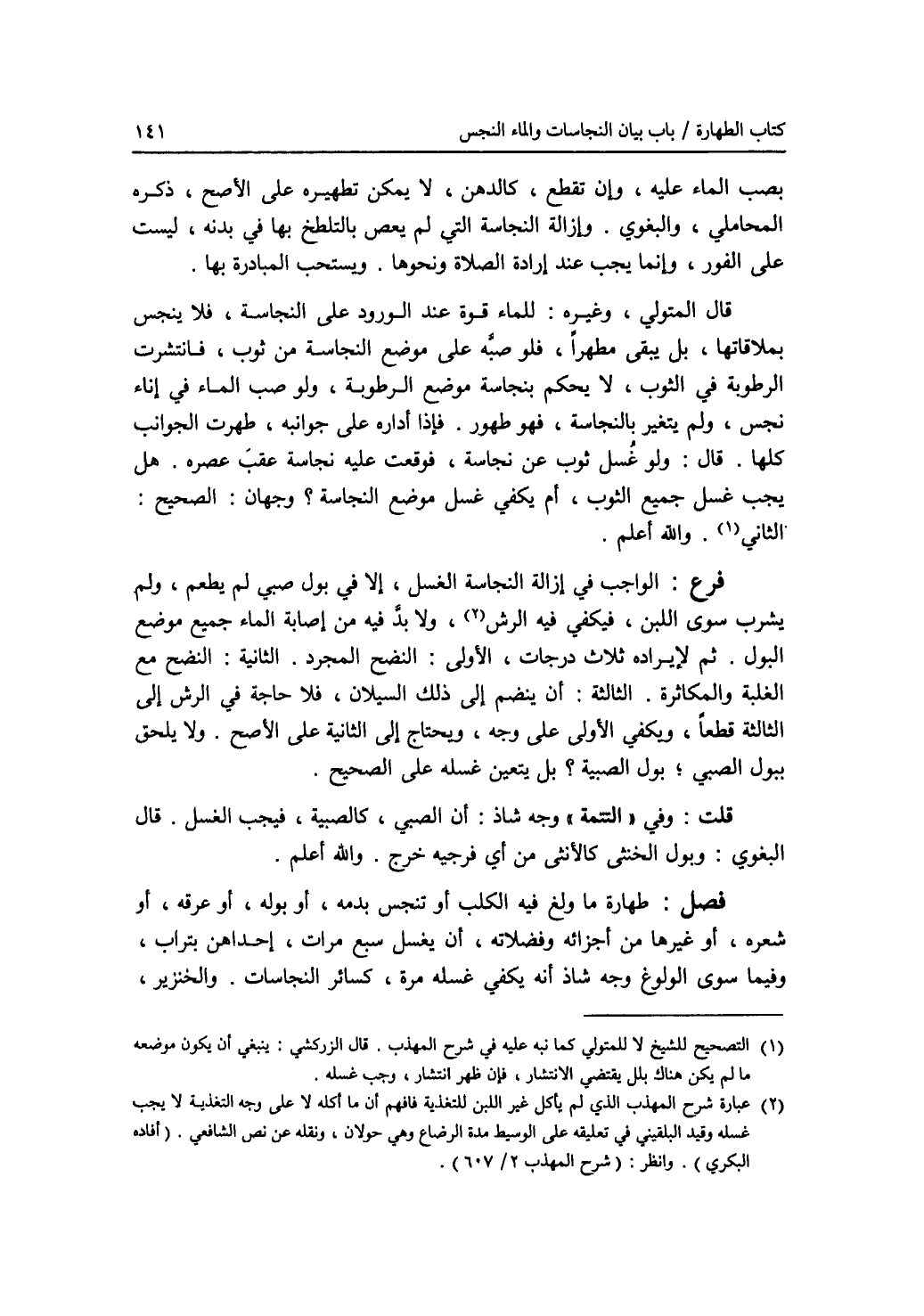 بصب الماء عليه، وإن تقطع، كالدهن، لا يمكن تطهيره على الاصح، ذكره المحاملي، والبغوي. وإزالة النجاسة التي لم يعص بالتلطخ بها في بدنه، ليست على الفور، وإنما يجب عند إرادة الصلاة ونحوها. ويستحب المبادرة بها. قال المتولي، وغيره: للماء قوة عند الورود على النجاسة، فلا ينجس بملاقاتها، بل يبقى مطهرا، فلو صبه على موضع النجاسة من ثوب فانتشرت الرطوبة في الثوب، لا يحكم بنجاسة موضع الرطوبة، ولو صب الماء في إناء نجس، ولم يتغير بالنجاسة، فهو طهور. فإذا أداره على جوانبه، طهرت الجوانب كلها. قال: ولو غسل ثوب عن نجاسة، فوقعت عليه نجاسة عقب عصره. هل يجب غسل جميع الثوب، أم يكفي غسل موضع النجاسة ؟ وجهان: الصحيح: الثاني (1). والله أعلم. فرع: الواجب في إزالة النجاسة الغسل، إلا في بول صبي لم يطعم، ولم يشرب سوى اللبن، فيكفي فيه الرش (2)، ولا بد فيه من إصابة الماء جميع موضع البول. ثم لايراده ثلاث درجات، الاولى: النضج المجرد. الثانية: النضح مع الغلبة والمكاثرة. الثالثة: أن ينضم إلى ذلك السيلان، فلا حاجة في الرش إلى الثالثة قطعا، ويكفي الاولى على وجه، ويحتاج إلى الثانية على الاصح. ولا يلحق ببول الصبي، بول الصبية ؟ بل يتعين غسله على الصحيح. قلت: وفي (التتمة) وجه شاذ: أن الصبي، كالصبية، فيجب الغسل. قال البغوي: وبول الخنثى كالانثى من أي فرجيه خرج. والله أعلم. فصل: طهارة ما ولغ فيه الكلب أو تنجس بدمه، أو بوله، أو عرقه، أو شعره، أو غيرها من أجزائه وفضلاته، أن يغسل سبع مرات، إحداهن بتراب، وفيما سوى الولوغ وجه شاذ أنه يكفي غسله مرة، كسائر النجاسات. والخنزير،