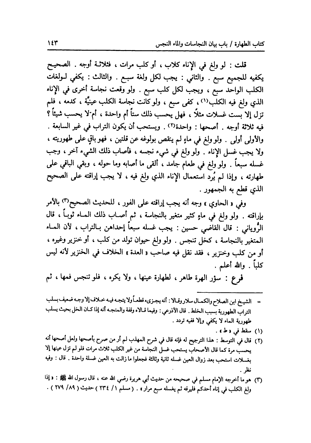 قلت: لو ولغ في الاناء كلاب، أو كلب مرات، فثلاثة أوجه. الصحيح يكفيه للجميع سبع. والثاني: يجب لكل ولغة سبع. والثالث: يكفي لولغات الكلب الواحد سبع، ويجب لكل كلب سبع. ولو وقعت نجاسة أخرى في الاناء الذي ولغ فيه الكلب (1)، كفى سبع، ولو كانت نجاسة الكلب عينية، كدمه، فلم تزل إلا بست غسلات مثلا، فهل يحسب ذلك ستا أم واحدة، أم لا يحسب شيئا ؟ فيه ثلاثة أوجه. أصحها: واحدة (2). ويستحب أن يكون التراب في غير السابعة. والاولى أولى. ولو ولغ في ماء لم ينقص بولوغه عن قلتين، فهو باق على طهوريته، ولا يجب غسل الاناء. ولو ولغ في شئ نجسه، فأصاب ذلك الشئ آخر، وجب غسله سبعا. ولو ولغ في طعام جامد، ألقى ما أصابه وما حوله، وبقي الباقي على طهارته، وإذا لم يرد استعمال الاناء الذي ولغ فيه، لا يجب إراقته على الصحيح التي قطع به الجمهور. وفي (الحاوي) وجه أنه يجب إراقته على الفور، للحديث الصحيح (3) بالامر بإراقته. ولو ولغ في ماء كثير متغير بالنجاسة، ثم أصاب ذلك الماء ثوبا، قال الروياني: قال القاضي حسين: يجب غسله سبعا إحداهن بالتراب، لان الماء المتغير بالنجاسة، كخل تنجس. ولو ولغ حيوان تولد من كلب، أو خنزير وغيره، أو من كلب وخنزير، فقد نقل فيه صاحب (العدة) الخلاف في الخنزير لانه ليس كلبا. والله أعلم. فرع: سؤر الهرة طاهر، لطهارة عينها، ولا يكره، فلو تنجس فمها، ثم