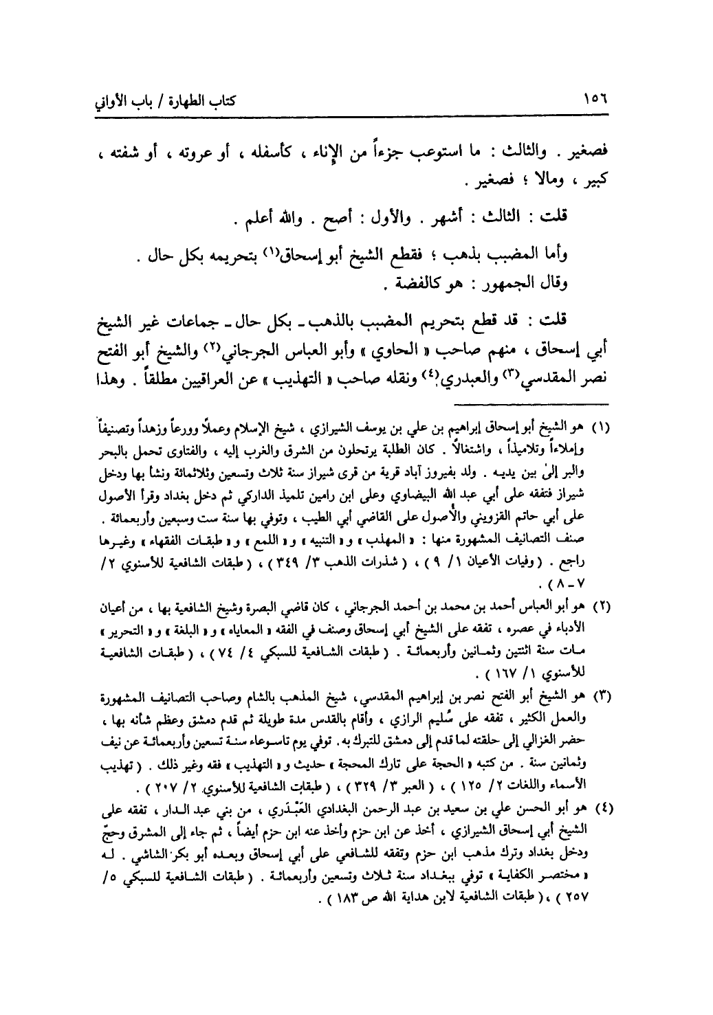 فصغير. والثالث: ما استوعب جزءا من الاناء، كأسفله، أو عروته، أو شفته، كبير، وما لا، فصغير. قلت: الثالث: أشهر. والاول: أصح. والله أعلم. وأما المضبب بذهب، فقطع الشيخ أبو إسحاق (1) بتحريمه بكل حال. وقال الجمهور: هو كالفضة. قلت: قد قطع بتحريم المضبب بالذهب - بكل حال - جماعات غير الشيخ أبي إسحاق، منهم صاحب (الحاوي) وأبو العباس الجرجاني (2) والشيخ أبو الفتح نصر المقدسي (3) والعبدري (4) ونقله صاحب (التهذيب) عن العراقيين مطلقا. وهذا