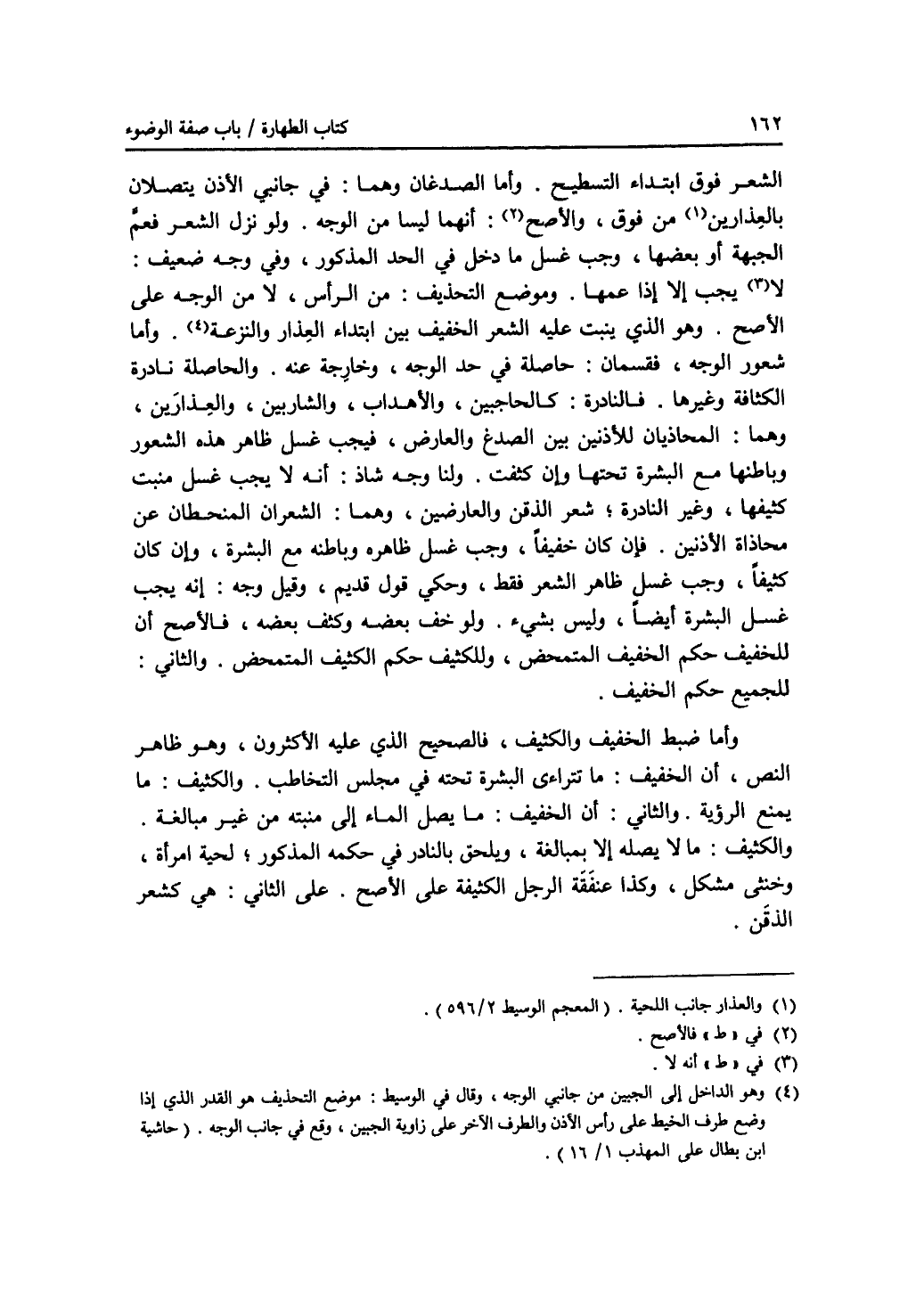 الشعر فوق ابتداء التسطيح. وأما الصدغان وهما: في جانبي الاذن يتصلان بالعذارين (1) من فوق، فالاصح (2): أنهما ليسا من الوجه. ولو نزل الشعر فعم الجبهة أو بعضها، وجب غسل ما دخل في الحد المذكور، وفي وجه ضعيف: لا (3) يجب إلا إذا عمها. وموضع التحذيف: من الرأس، لا من الوجه على الاصح. وهو الذي ينبت عليه الشعر الخفيف بين ابتداء العذار والنزعة (4). وأما شعور الوجه فقسمان: حاصلة في حد الوجه، وخارجة عنه. والحاصلة نادرة الكثافة وغيرها. فالنادرة: كالحاجبين، والاهداب، والشاربين، والعذارين، وهما: المحاذيان للاذنين بين الصدغ والعارض، فيجب غسل ظاهر هذه الشعور وباطنها مع البشرة تحتها وإن كثفت. ولنا وجه شاذ: أنه لا يجب غسل منبت كثيفها، وغير النادرة، شعر الذقن والعارضين، وهما: الشعران المنحطان عن محاذاة الاذنين. فان كان خفيفا، وجب غسل ظاهره وباطنه مع البشرة، وإن كان كثيفا، وجب غسل ظاهر الشعر فقط، وحكي قول قديم، وقيل وجه: إنه يجب غسل البشرة أيضا، وليس بشئ. ولو خف بعضه وكثف بعضه، فالاصح أن للخفيف حكم الخفيف المتمحض، وللكثيف حكم الكثيف المتمحض. والثاني: للجميع حكم الخفيف. وأما ضبط الخفيف والكثيف، فالصحيح الذي عليه الاكثرون، وهو ظاهر النص، أن الخفيف: ما تتراءى البشرة تحته في مجلس التخاطب. والكثيف: ما يمنع الرؤية. والثاني: أن الخفيف: ما يصل الماء إلى منبته من غير مبالغة. والكثيف: ما لا يصله إلا بمبالغة، ويلحق بالنادر في حكمه المذكور، لحية امرأة، وخنثى مشكل، وكذا عنفقة الرجل الكثيفة على الاصح. وعلى الثاني: هي كشعر الذقن.