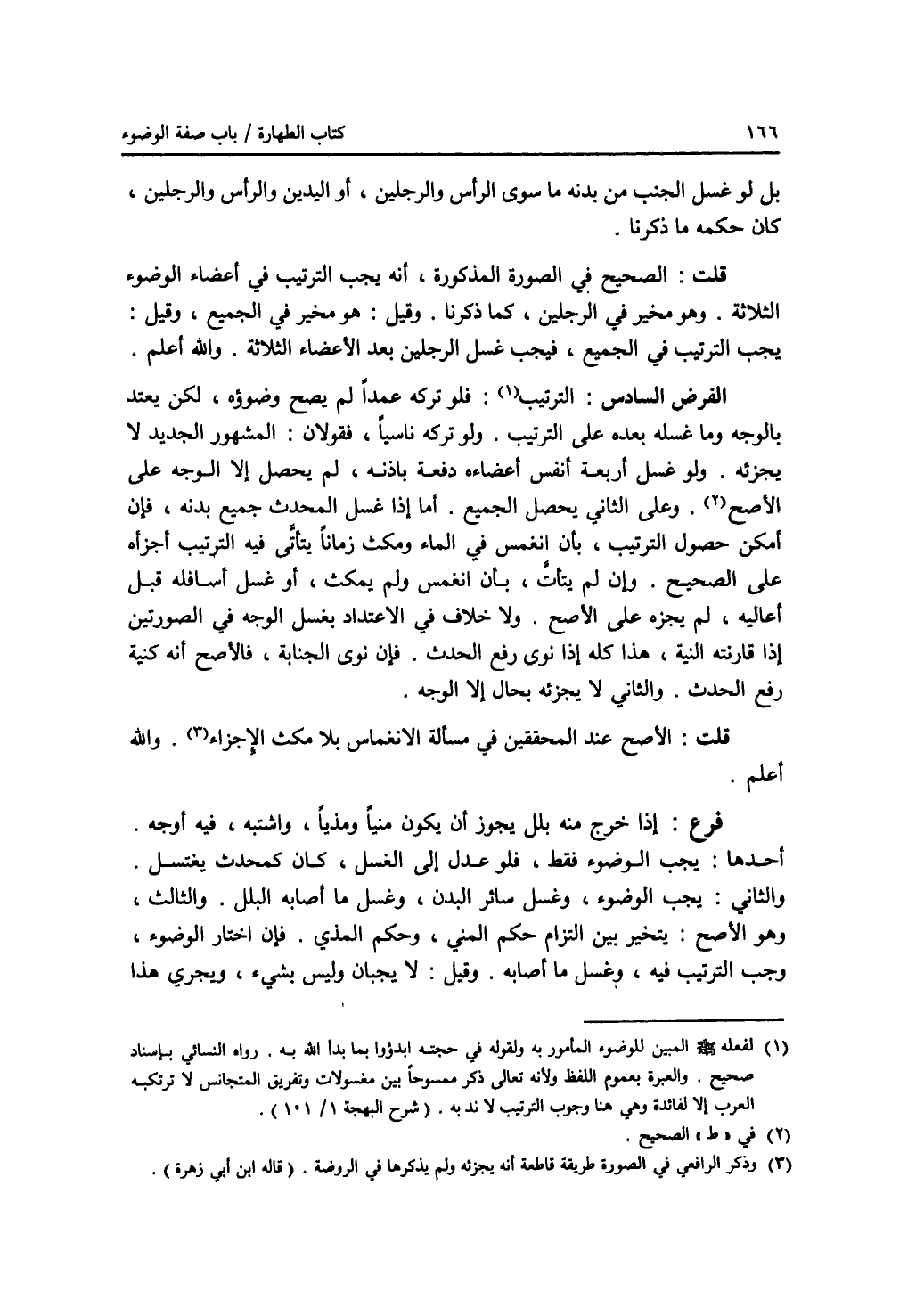 بل لو غسل الجنب من بدنه ما سوى الرأس والرجلين، أو اليدين والرأس والرجلين، كان حكمه ما ذكرنا. قلت: الصحيح في الصورة المذكورة، أنه يجب الترتيب في أعضاء الوضوء الثلاثة. وهو مخير في الرجلين، كما ذكرنا. وقيل: هو مخير في الجميع، وقيل: يجب الترتيب في الجميع، فيجب غسل الرجلين بعد الاعضاء الثلاثة. والله أعلم. الفرض السادس: الترتيب (1): فلو تركه عمدا لم يصح وضوؤه، لكن يعتد بالوجه وما غسله بعده على الترتيب. ولو تركه ناسيا، فقولان: المشهور الجديد لا يجزئه. ولو غسل أربعة أنفس أعضاءه دفعة باذنه، لم يحصل إلا الوجه على الاصح (2). وعلى الثاني يحصل الجميع. أما إذا غسل المحدث جميع بدنه، فإن أمكن حصول الترتيب، بأن انغمس في الماء ومكث زمانا يتأتى فيه الترتيب أجزأه على الصحيح. وإن لم يتأت، بأن انغمس ولم يمكث، أو غسل أسافله قبل أعاليه، لم يجزه على الاصح. ولا خلاف في الاعتداد بغسل الوجه في الصورتين إذا قارنته النية، هذا كله إذا نوى رفع الحدث. فان نوى الجنابة، فالاصح أنه كنية رفع الحدث. والثاني لا يجزئه بحال إلا الوجه. قلت: الاصح عند المحققين في مسألة الانغماس بلا مكث الاجزاء (3). والله أعلم. فرع: إذا خرج منه بلل يجوز أن يكون منيا ومذيا، واشتبه، ففيه أوجه. أحدها: يجب الوضوء فقط، فلو عدل إلى الغسل، كان كمحدث يغتسل. والثاني: يجب الوضوء، وغسل سائر البدن، وغسل ما أصابه البلل. والثالث، وهو الاصح: يتخير بين التزام حكم المني، وحكم المذي. فإن اختار الوضوء وجب الترتيب فيه، وغسل ما أصابه. وقيل: لا يجبان وليس بشئ، ويجري هذا