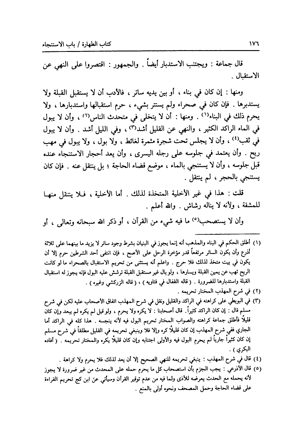 قال جماعة: ويجتنب الاستدبار أيضا. والجمهور: اقتصروا على النهي عن الاستقبال. ومنها: إن كان في بناء، أو بين يديه ساتر، فالادب أن لا يستقبل القبلة ولا يستدبرها. فإن كان في صحراء ولم يستتر بشئ، حرم استقبالها واستدبارها، ولا يحرم ذلك في البناء (1). ومنها: أن لا يتخلى في متحدث الناس (2)، وأن لا يبول في الماء الراكد الكثير، والنهي عن القليل أشد (3)، وفي الليل أشد. وأن لا يبول في ثقب (4)، وأن لا يجلس تحت شجرة مثمرة لغائط، ولا بول، ولا يبول في مهب ريح. وأن يعتمد في جلوسه على رجله اليسرى، وأن يعد أحجار الاستنجاء عنده قبل جلوسه، وأن لا يستنجي بالماء، موضع قضاء الحاجة، بل ينتقل عنه. فإن كان يستنجي بالحجر، لم ينتقل. قلت: هذا في غير الا خلية المتخذة لذلك. أما الا خلية، فلا ينتقل منها للمشقة، ولانه لا يناله رشاش. والله أعلم. وأن لا يستصحب (5) ما فيه شئ من القرآن، أو ذكر الله سبحانه وتعالى، أو