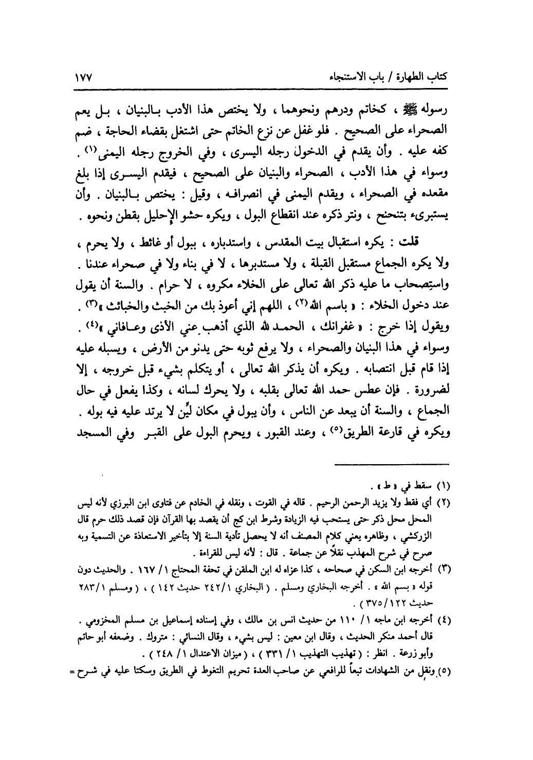 رسوله - صلى الله عليه وسلم -، كخاتم ودرهم ونحوهما، ولا يختص هذا الادب بالبنيان، بل يعم الصحراء على الصحيح. فلو غفل عن نزع الخاتم حتى اشتغل بقضاء الحاجة، ضم كفه عليه. وأن يقدم في الدخول رجله اليسرى، وفي الخروج اليمنى (1)، وسواء في هذا الادب، الصحراء والبنيان على الصحيح، فيقدم اليسرى إذا بلغ مقعده في الصحراء، ويقدم اليمنى في انصرافه، وقيل: يختص بالبنيان. وأن يستبرئ بتنحنح، ونتر ذكره عند انقطاع البول، ويكره حشو الاحليل بقطن ونحوه. قلت: يكره استقبال بيت المقدس، واستدباره، ببول أو غائط، ولا يحرم، ولا يكره الجماع مستقبل القبلة، ولا مستدبرها، لا في بناء ولا في صحراء عندنا. واستصحاب ما عليه ذكر الله تعالى. على الخلاء مكروه، لا حرام. والسنة أن يقول عند دخول الخلاء: (باسم الله (2)، اللهم إني أعوذ بك من الخبث والخبائث) (3). ويقول إذا خرج: (غفرانك، الحمد لله الذي أذهب عني الاذى وعافاني) (4). وسواء في هذا البنيان والصحراء، ولا يرفع ثوبه حتى يدنو من الارض، ويسبله عليه إذا قام قبل انتصابه. ويكره أن يذكر الله تعالى، أو يتكلم بشئ قبل خروجه، إلا لضرورة. فإن عطس حمد الله تعالى بقلبه، ولا يحرك لسانه، وكذا يفعل في حال الجماع، والسنة أن يبعد عن الناس، وأن يبول في مكان لين لا يرتد عليه فيه بوله. ويكره في قارعة الطريق، (5) وعند القبور، ويحرم البول على القبر. وفي المسجد