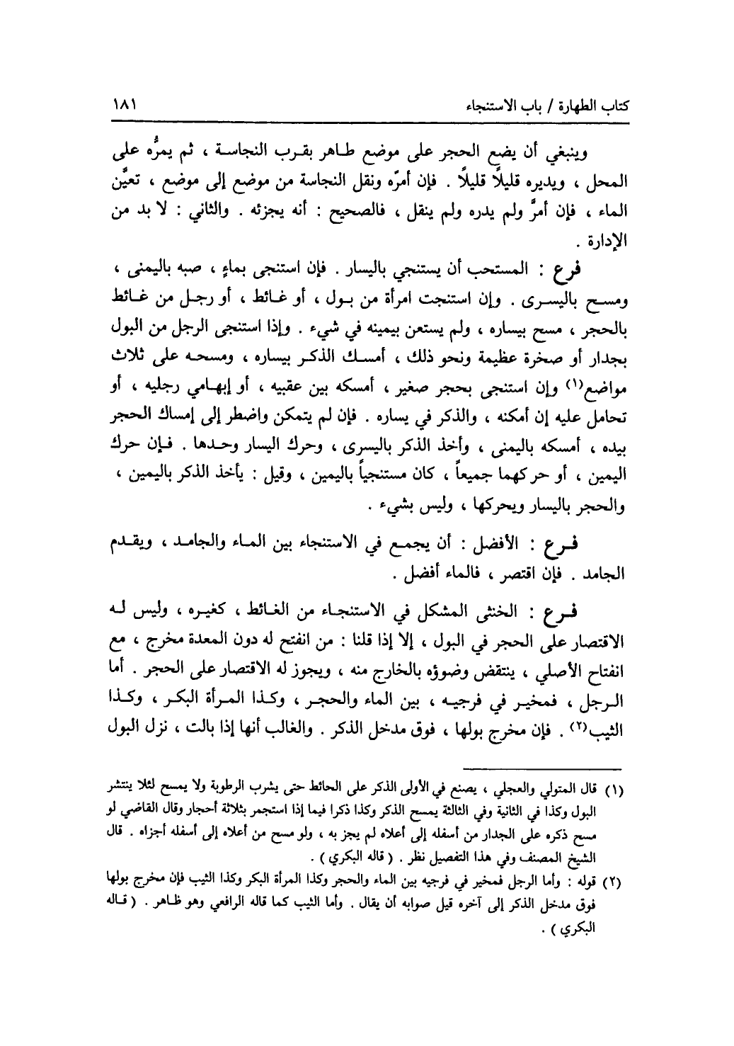 وينبغي أن يضع الحجر على موضع طاهر بقرب النجاسة، ثم يمره على المحل، ويديره قليلا قليلا. فإن أمره ونقل النجاسة من موضع إلى موضع، تعين الماء، فإن أمر ولم يدره ولم ينقل، فالصحيح: أنه يجزئه. والثاني: لا بد من الادارة. فرع: المستحب أن يستنجي باليسار. فإن استنجى بماء، صبه باليمنى، ومسح باليسرى. وإن استنجت امرأة من بول، أو غائط، أو رجل من غائط بالحجر، مسح بيساره، ولم يستعن بيمينه في شئ. وإذا استنجى الرجل من البول بجدار أو صخرة عظيمة ونحو ذلك، أمسك الذكر بيساره ومسحه على ثلاث مواضع (1). وإذا استنجى بحجر صغير، أمسكه بين عقبيه، أو إبهامي رجليه، أو تحامل عليه إن أمكنه، والذكر في يساره. فإن لم يتمكن واضطر إلى إمساك الحجر بيده، أمسكه باليمنى، وأخذ الذكر باليسرى، وحرك اليسار وحدها. فإن حرك اليمنى، أو حركهما جميعا، كان مستنجيا باليمين. وقيل: يأخذ الذكر باليمين، والحجر باليسار ويحركها، وليس بشئ. فرع: الافضل: أن يجمع في الاستنجاء بين الماء والجامد، ويقدم الجامد. فإن اقتصر، فالماء أفضل. فرع: الخنثى المشكل في الاستنجاء من الغائط، كغيره، وليس له الاقتصار على الحجر في البول، إلا إذا قلنا: من انفتح له دون المعدة مخرج، مع انفتاح الاصلي، ينتقض وضوؤه بالخارج منه، ويجوز له الاقتصار على الحجر. أما الرجل، فمخير في فرجيه، بين الماء والحجر، وكذا المرأة البكر، وكذا الثيب (2). فإن مخرج بولها، فوق مدخل الذكر. والغالب أنها إذا بالت، نزل البول