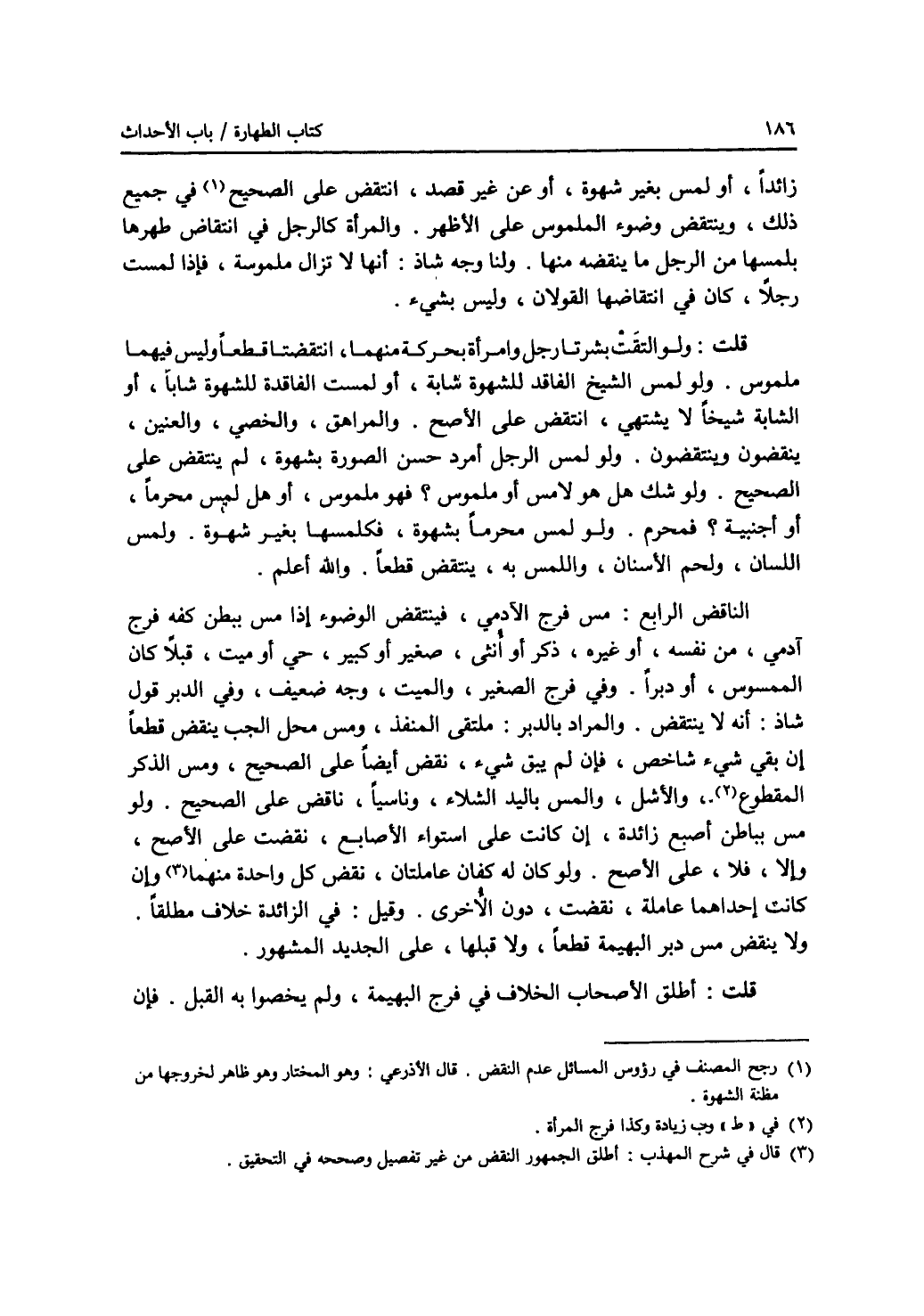 زائدا، أو لمس بغير شهوة، أو عن غير قصد، انتقض على الصحيح (1) في جميع ذلك، وينتقض وضوء الملموس على الاظهر. والمرأة كالرجل في انتقاض طهرها بلمسها من الرجل ما ينقضه منها. ولنا وجه شاذ: أنها لا تزال ملموسة، فإذا لمست رجلا، كان في انتقاضها القولان، وليس بشئ. قلت: ولو التقت بشرتا رجل وامرأة بحركة منهما، انتقضتا قطعا وليس فيهما ملموس. ولو لمس الشيخ الفاقد للشهوة شابة، أو لمست الفاقدة للشهوة شابا، أو الشابة شيخا لا يشتهى، انتقض على الاصح. والمراهق، والخصي، والعنين، ينقضون وينتقضون. ولو لمس الرجل أمرد حسن الصورة بشهوة، لم ينتقض على الصحيح. ولو شك هل هو لامس أو ملموس ؟ فهو ملموس، أو هل لمس محرما، أو أجنبية ؟ فمحرم. ولو لمس محرما بشهوة، فكلمسها بغير شهوة. ولمس اللسان، ولحم الاسنان، واللمس به، ينتقض قطعا. والله أعلم. الناقض الرابع: مس فرج الآدمي، فينتقض الوضوء إذا مس ببطن كفه فرج آدمي، من نفسه، أو غيره، ذكر أو أنثى، صغير أو كبير، حي أو ميت، قبلا كان الممسوس، أو دبرا. وفي فرج الصغير، والميت، وجه ضعيف، وفي الدبر قول شاذ: أنه لا ينتقض. والمراد بالدبر: ملتقى المنفذ، ومس محل الجب ينقض قطعا إن بقي شئ شاخص، فإن لم يبق شئ، نقض أيضا على الصحيح، ومس الذكر المقطوع (2) والاشل، والمس باليد الشلاء، وناسيا، ناقض على الصحيح. ولو مس بباطن أصبع زائدة، إن كانت على استواء الاصابع، نقضت على الاصح، وإلا، فلا، على الاصح. ولو كان له كفان عاملتان، نقض كل واحدة منهما (3). وإن كانت إحداهما عاملة، نقضت، دون الاخرى. وقيل: في الزائدة خلاف مطلقا. ولا ينقض مس دبر البهيمة قطعا، ولا قبلها، على الجديد المشهور. قلت: أطلق الاصحاب الخلاف في فرج البهيمة، ولم يخصوا به القبل. فإن