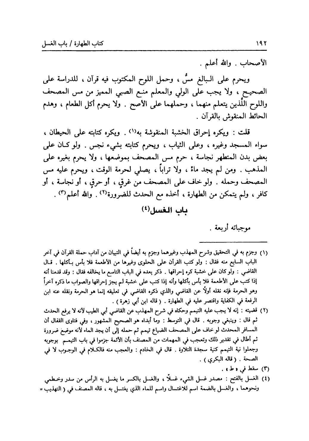الاصحاب. والله أعلم. ويحرم على البالغ مس، وحمل اللوح المكتوب فيه قرآن، للدراسة على الصحيح، ولا يجب على الولي والمعلم منع الصبي المميز من مس المصحف واللوح اللذين يتعلم منهما، وحملهما على الاصح. ولا يحرم أكل الطعام، وهدم الحائط المنقوش بالقرآن. قلت: ويكره إحراق الخشبة المنقوشة به (1). ويكره كتابته على الحيطان، سواء المسجد وغيره، وعلى الثياب، ويحرم كتابته بشئ نجس. ولو كان على بعض بدن المتطهر نجاسة، حرم مس المصحف بموضعها، ولا يحرم بغيره على المذهب. ومن لم يجد ماء، ولا ترابا، يصلي لحرمة الوقت، ويحرم عليه مس المصحف وحمله. ولو خاف على المصحف من غرق، أو حرق، أو نجاسة، أو كافر، ولم يتمكن من الطهارة، أخذه مع الحدث للضرورة (2). والله أعلم (3).
