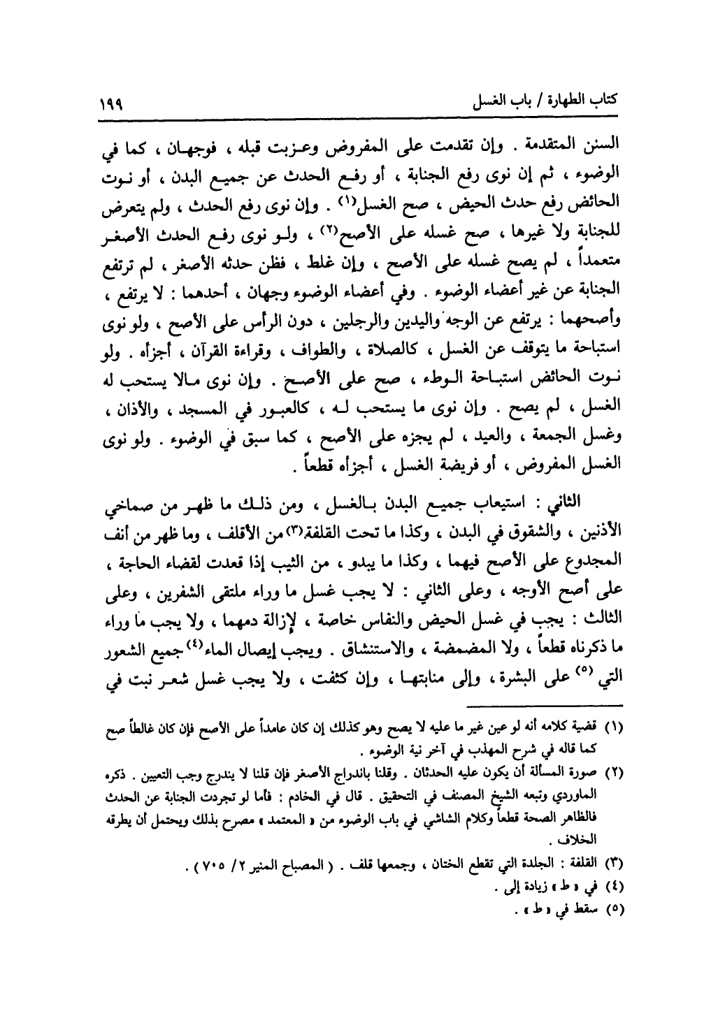السنن المتقدمة. وإن تقدمت على المفروض وعزبت قبله، فوجهان، كما في الوضوء، ثم إن نوى رفع الجنابة، أو رفع الحدث عن جميع البدن، أو نوت الحائض رفع حدث الحيض، صح الغسل (1). وإن نوى رفع الحدث، ولم يتعرض للجنابة ولا غيرها، صح غسله على الاصح (2)، ولو نوى رفع الحدث الاصغر متعمدا، لم يصح غسله على الاصح، وإن غلط، فظن حدثه الاصغر، لم ترتفع الجنابة عن غير أعضاء الوضوء. وفي أعضاء الوضوء وجهان، أحدهما: لا يرتفع، وأصحهما: يرتفع عن الوجه واليدين والرجلين، دون الرأس على الاصح، ولو نوى استباحة ما يتوقف عن الغسل، كالصلاة، والطواف، وقراءة القرآن، أجزأه. ولو نوت الحائض استباحة الوطئ، صح على الاصح. وإن نوى ما لا يستحب له الغسل، لم يصح. وإن نوى ما يستحب له، كالعبور في المسجد، والاذان، وغسل الجمعة، والعيد، لم يجزه على الاصح، كما سبق في الوضوء. ولو نوى الغسل المفروض، أو فريضة الغسل، أجزأه قطعا. الثاني: استيعاب جميع البدن بالغسل، ومن ذلك ما ظهر من صماخي الاذنين، والشقوق في البدن، وكذا ما تحت القلفة (3) من الاقلف، وما ظهر من أنف المجدوع على الاصح فيهما، وكذا ما يبدو، من الثيب إذا قعدت لقضاء الحاجة، على أصح الاوجه، وعلى الثاني: لا يجب غسل ما وراء ملتقى الشفرين، وعلى الثالث: يجب في غسل الحيض والنفاس خاصة، لازالة دمهما، ولا يجب ما وراء ما ذكرناه قطعا، ولا المضمضة، والاستنشاق. ويجب إيصال الماء (4) جميع الشعور التي (5) على البشرة، وإلى منابتها، وإن كثفت، ولا يجب غسل شعر نبت في