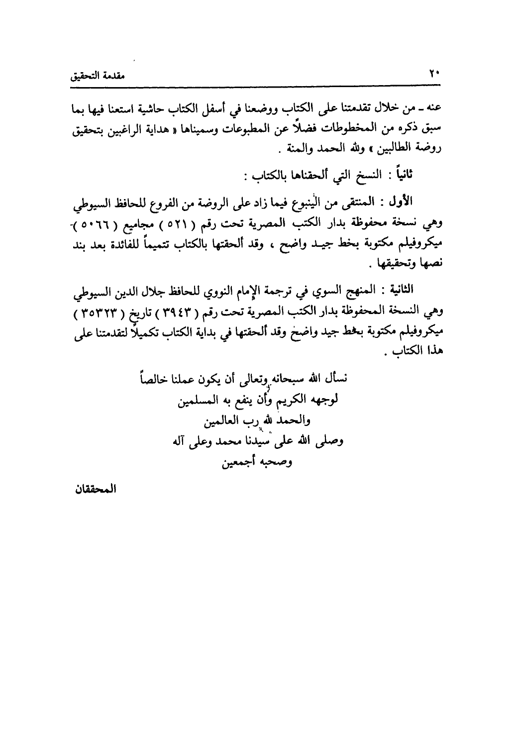 عنه - من خلال تقدمتنا على الكتاب ووضعنا في أسفل الكتاب حاشية استعنا فيها بما سبق ذكره من المخطوطات فضلا عن المطبوعات وسميناها (هداية الراغبين بتحقيق روضة الطالبين) ولله الحمد والمنة. ثانيا: النسخ التي ألحقنا بالكتاب. الاول: المنتقى من الينبوع فيما زاد على الروضة من الفروع للحافظ السيوطي وهي نسخة محفوظة بدار الكتب المصرية تحت رقم (521) مجاميع (5066) ميكروفيلم مكتوبة بحظ جيد واضح، وقد ألحقتها بالكتاب تتميما للفائدة بعد بند نصها وتحقيقها. الثانية: المنهج السوي في ترجمة الامام النووي للحاظ جلال الدين السيوطي وهي النسخة المحفوظة بدار الكتب المصرية تحت رقم (3943) تاريخ (35323) ميكروفيلم مكتوبة بحظ جيد واضح وقد ألحقتها في بداية الكتاب تكميلا لتقدمتنا على هذا الكتاب. نسأل الله سبحانه وتعالى أن يكون عملنا خالصا لوجهه الكريم وأن ينفع به المسلمين. والحمد لله رب العالمين. وصلى الله على سيدنا محمد وعلى آله وصحبه أجمعين