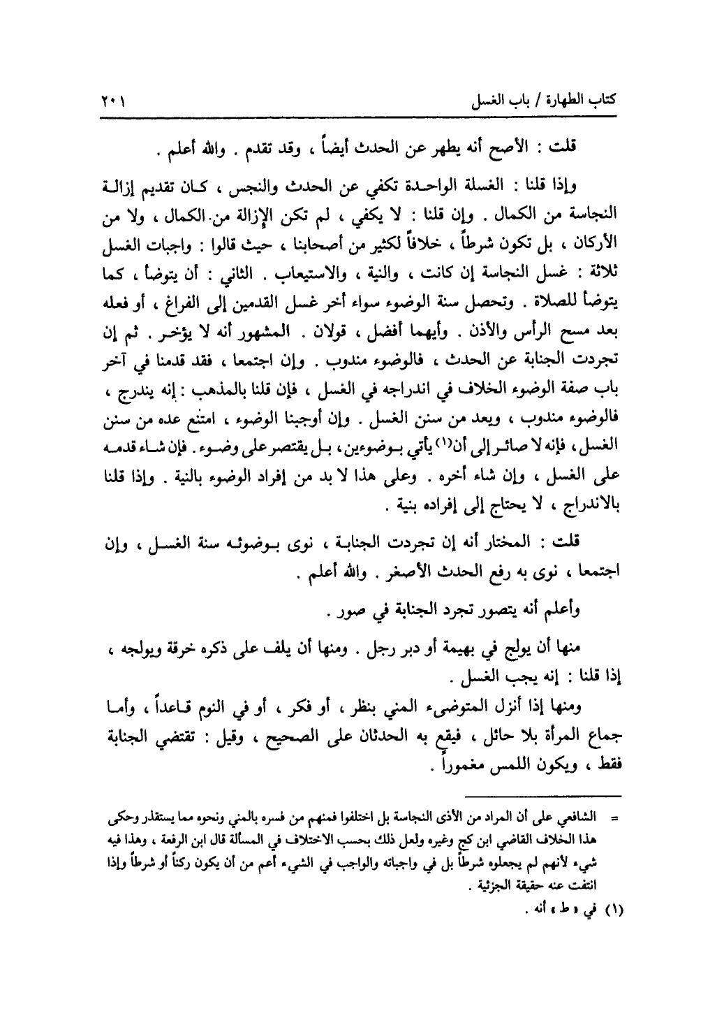قلت: الاصح أنه يطهر عن الحدث أيضا، وقد تقدم. والله أعلم. وإذا قلنا: الغسلة الواحدة تكفي عن الحدث والنجس، كان تقديم إزالة النجاسة من الكمال. وإن قلنا: لا يكفي، لم تكن الازالة من الكمال، ولا من الاركان، بل تكون شرطا، خلافا لكثير من أصحابنا، حيث قالوا: واجبات الغسل ثلاثة: غسل النجاسة إن كانت، والنية، والاستيعاب. الثاني: أن يتوضأ، كما يتوضأ للصلاة. وتحصل سنة الوضوء سواء أخر غسل القدمين إلى الفراغ، أو فعله بعد مسح الرأس والاذن. وأيهما أفضل، قولان. المشهور أنه لا يؤخر. ثم إن تجردت الجنابة عن الحدث، فالوضوء مندوب. وإن اجتمعا، فقد قدمنا في آخر باب صفة الوضوء الخلاف في اندراجه في الغسل، فإن قلنا بالمذهب: أنه يندرج، فالوضوء مندوب، ويعد من سنن الغسل. وإن أوجبنا الوضوء، امتنع عده من سنن الغسل، فإنه لا صائر إلى أن (1) يأتي بوضوءين، بل يقتصر على وضوء. فإن شاء قدمه على الغسل، وإن شاء أخره. وعلى هذا لا بد من إفراد الوضوء بالنية. وإذا قلنا بالاندراج، لا يحتاج إلى إفراده بنية. قلت: المختار أنه إن تجردت الجنابة، نوى بوضوئه سنة الغسل، وإن اجتمعا، نوى به رفع الحدث الاصغر. والله أعلم. واعلم أنه يتصور تجرد الجنابة في صور. منها أن يولج في بهيمة أو دبر رجل. ومنها أن يلف على ذكره خرقة ويولجه، وإذا قلنا: إنه يجب الغسل. ومنها إذا أنزل المتوضئ المني بنظر، أو فكر، أو في النوم قاعدا. وأما جماع المرأة بلا حائل، فيقع به الحدثان على الصحيح، وقيل: تقتضي الجنابة فقط، ويكون اللمس مغمورا.
