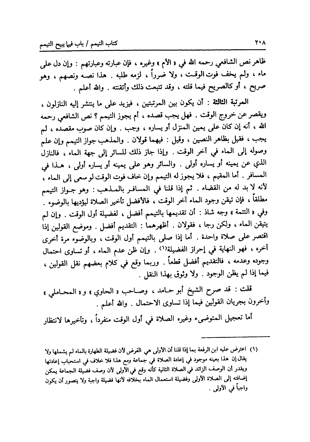 ظاهر نص الشافعي رحمه الله في (الام) وغيره، فإن عبارته وعبارتهم: وإن دل على ماء، ولم يخف فوت الوقت، ولا ضررا، لزمه طلبه. هذا نصه ونصهم، وهو صريح، أو كالصريح فيما قلته، وقد تتبعت ذلك وأتقنته. والله أعلم. المرتبة الثالثة: أن يكون بين المرتبتين، فيزيد على ما ينتشر إليه النازلون، ويقصر عن خروج الوقت. فهل يجب قصده، أم يجوز التيمم ؟ نص الشافعي رحمه الله، أنه إن كان على يمين المنزل أو يساره، وجب. وإن كان صوب مقصده، لم يجب، فقيل بظاهر النصين، وقيل: فيهما قولان. والمذهب جواز التيمم وإن علم وصوله إلى الماء في آخر الوقت. وإذا جاز ذلك للسائر إلى جهة الماء، فالنازل الذي عن يمينه أو يساره أولى. والسائر وهو على يمينه أو يساره أولى، هذا في المسافر. أما المقيم، فلا يجوز له التيمم وإن خاف فوت الوقت لو سعى إلى الماء، لانه لا بد له من القضاء. ثم إذا قلنا في المسافر بالمذهب: وهو جواز التيمم مطلقا، فإن تيقن وجود الماء آخر الوقت، فالافضل تأخير الصلاة ليؤديها بالوضوء. وفي (التتمة) وجه شاذ: أن تقديمها بالتيمم أفضل، لفضيلة أول الوقت. وإن لم يتيقن الماء، ولكن رجا، فقولان. أظهرهما: التقديم أفضل. وموضع القولين إذا اقتصر على صلاة واحدة. أما إذا صلى بالتيمم أول الوقت، وبالوضوء مرة أخرى آخره، فهو النهاية في إحراز الفضيلة (1). وإن ظن عدم الماء، أو تساوى احتمال وجوده وعدمه، فالتقديم أفضل قطعا. وربما وقع في كلام بعضهم نقل القولين، فيما إذا لم يظن الوجود. ولا وثوق بهذا النقل. قلت: قد صرح الشيخ أبو حامد، وصاحب (الحاوي) و (المحاملي) وآخرون بجريان القولين فيما إذا تساوى الاحتمال. والله أعلم. أما تعجيل المتوضئ وغيره الصلاة في أول الوقت منفردا، وتأخيرها لانتظار